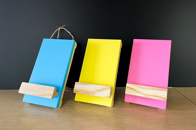 スマホスタンドは水色・黄色・ピンクの3色から1つを選べます。