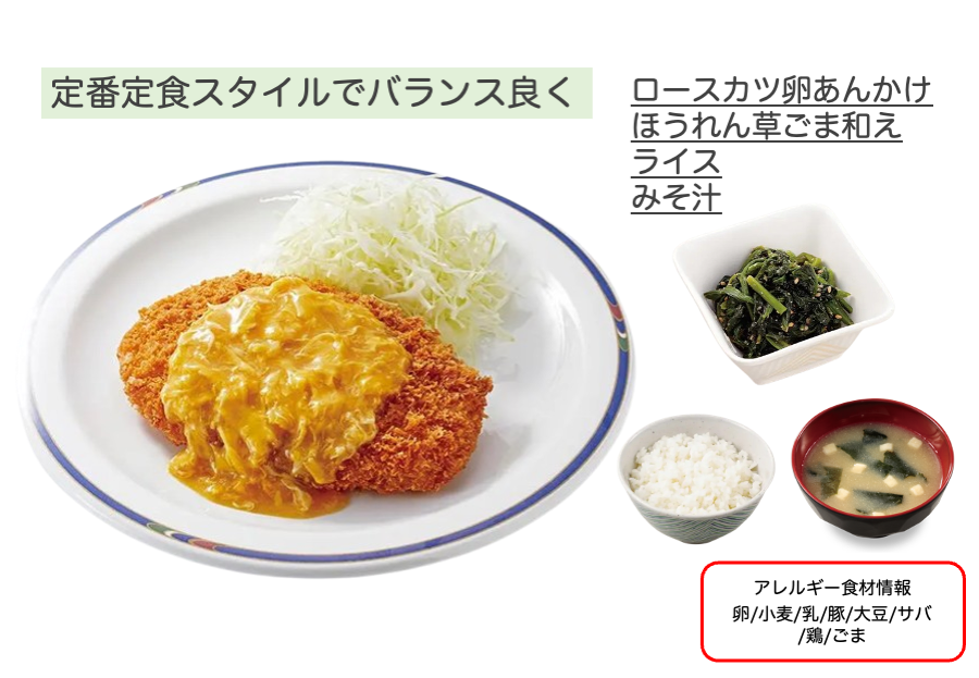 ②ロースかつ卵かけ定食 ほうれん草胡麻和え・ライス・味噌汁つき