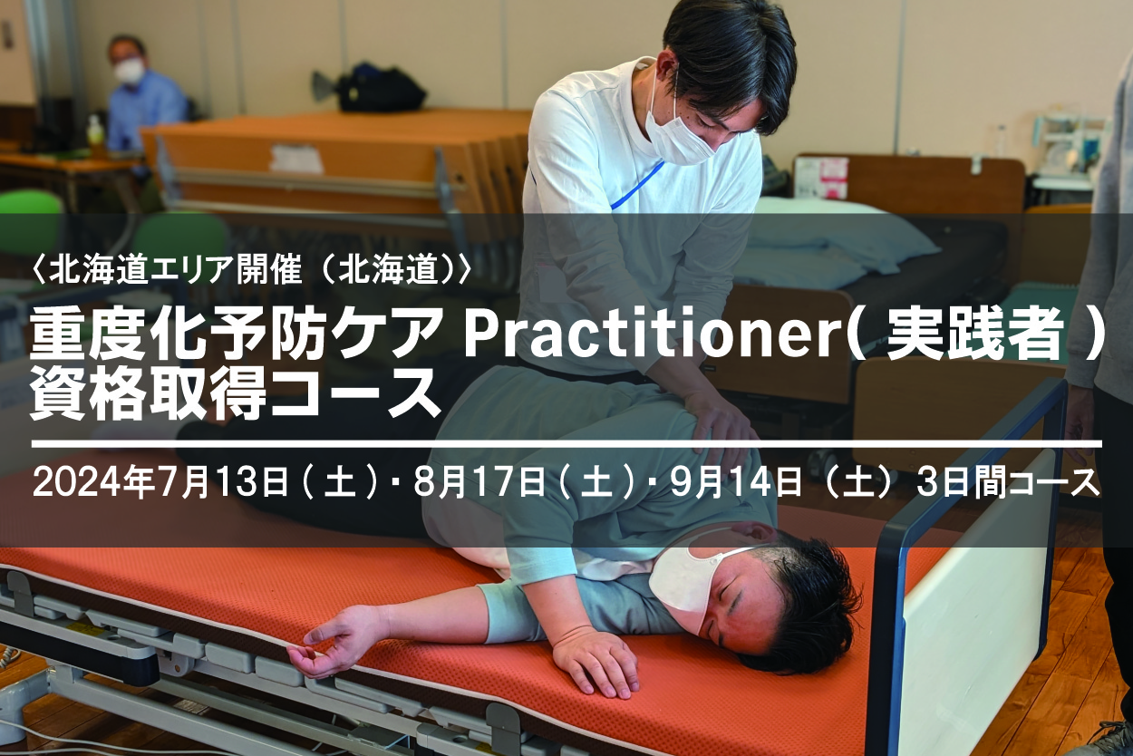 重度化予防ケアPractitioner(実践者)養成研修とは、医療・介護に携わる支援者の方が重度化の予防に必要な知識・技術等を修得し、それぞれの現場で重度化の予防を実践できるようになることを目的としています。3日間を通し、現場で起きている重度化の原因の理解と考え方、そして予防のための基本的な技術とケアマネジメント、実際の福祉用具を使用した実技などを通して重度化予防ケアを学んでいきます。養成研修の修了時には現場実践報告書を提出していただき、合格した方には重度化予防ケアPractitioner(実践者)の協会認定証とピンバッチを付与いたします。
