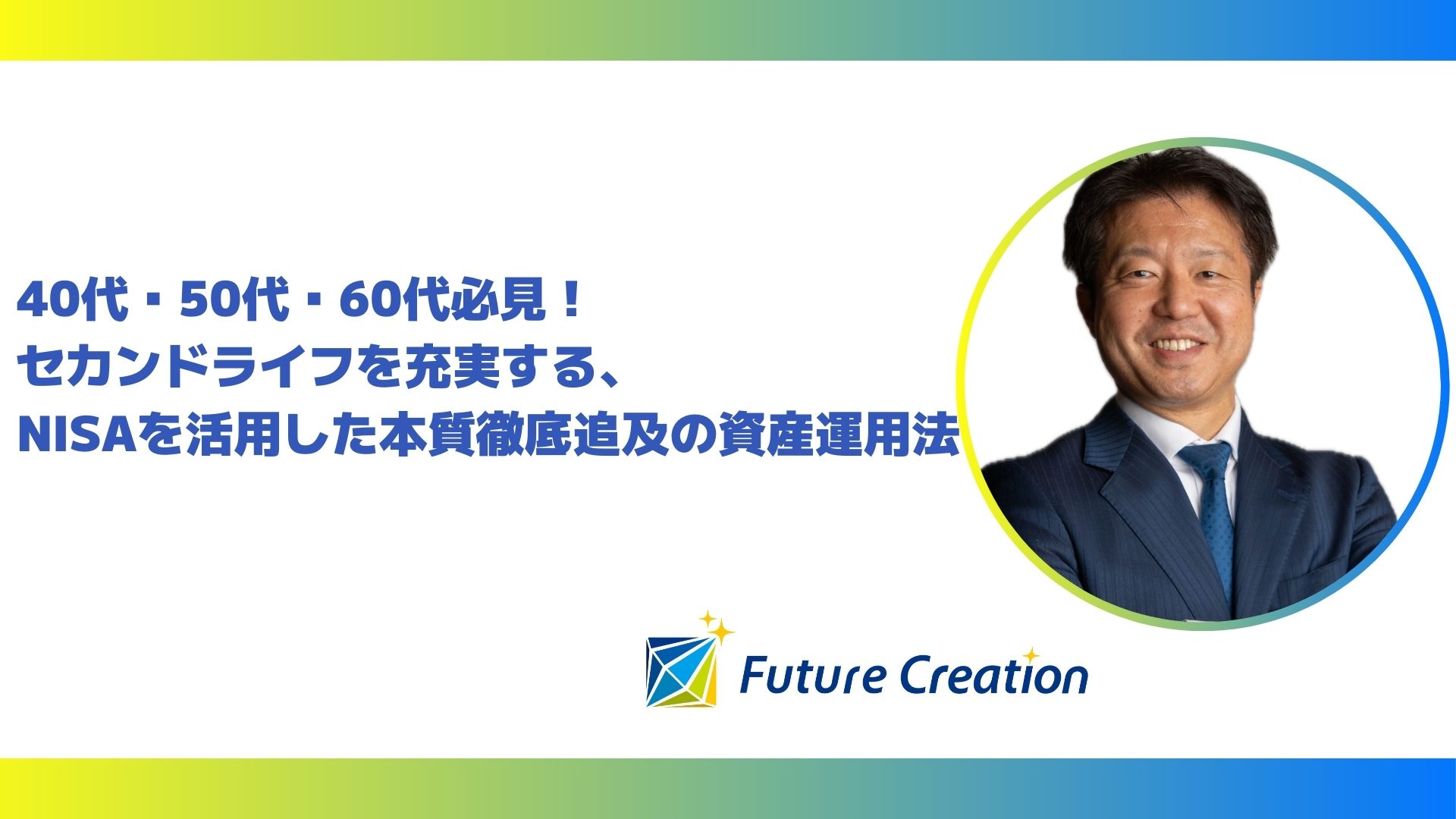 株式会社フューチャー・クリエイション 金融商品仲介業者 近畿財務局長(金仲)90号 本案内に記載のセミナーでは、セミナーでご紹介する商品等の勧誘を行うことがあります。 各商品等にご投資いただく際には商品毎に所定の手数料や諸経費等をご負担いただく場合があります。 又、各商品等には価格の変動等による損失を生じる恐れがあります。 各商品等へのご投資にかかる手数料等およびリスクについては、当該商品等の契約締結前交付書面、目論見書、お客様向け資料等をよくお読みになり内容について十分にご理解ください。広告等の規制(金融商品取引法66条10)