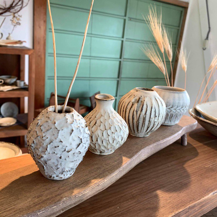 mossomさんの粉引一輪挿し作りを体験していただけます。 色々な姿の花入れからお好きな形を選んで自由に模様を彫り、世界に1 つの粉引一輪挿しを作ります。 ①13 : 00 ~ ②14 : 00 ~ 参加費 : 800 ~ 2000 円/ 個〈各回定員4 名〉 小さなお子様が参加される場合は、大人の方がフォローしていただきますようお願いいたします。