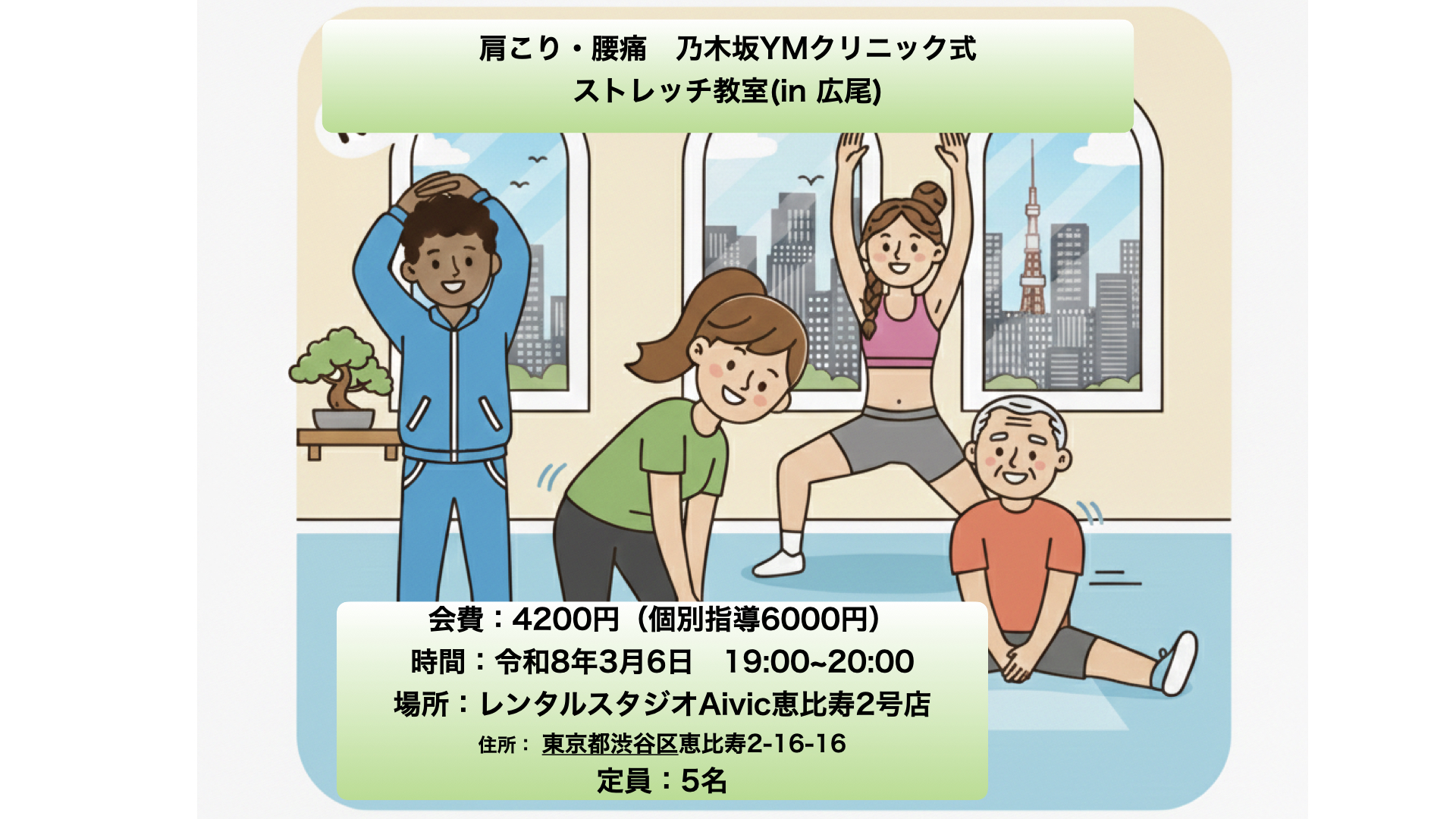 乃木坂YMクリニックにて日々難治性の肩こり腰痛患者様を治療している知見を元に、独自のストレッチ方法を考案しています。
