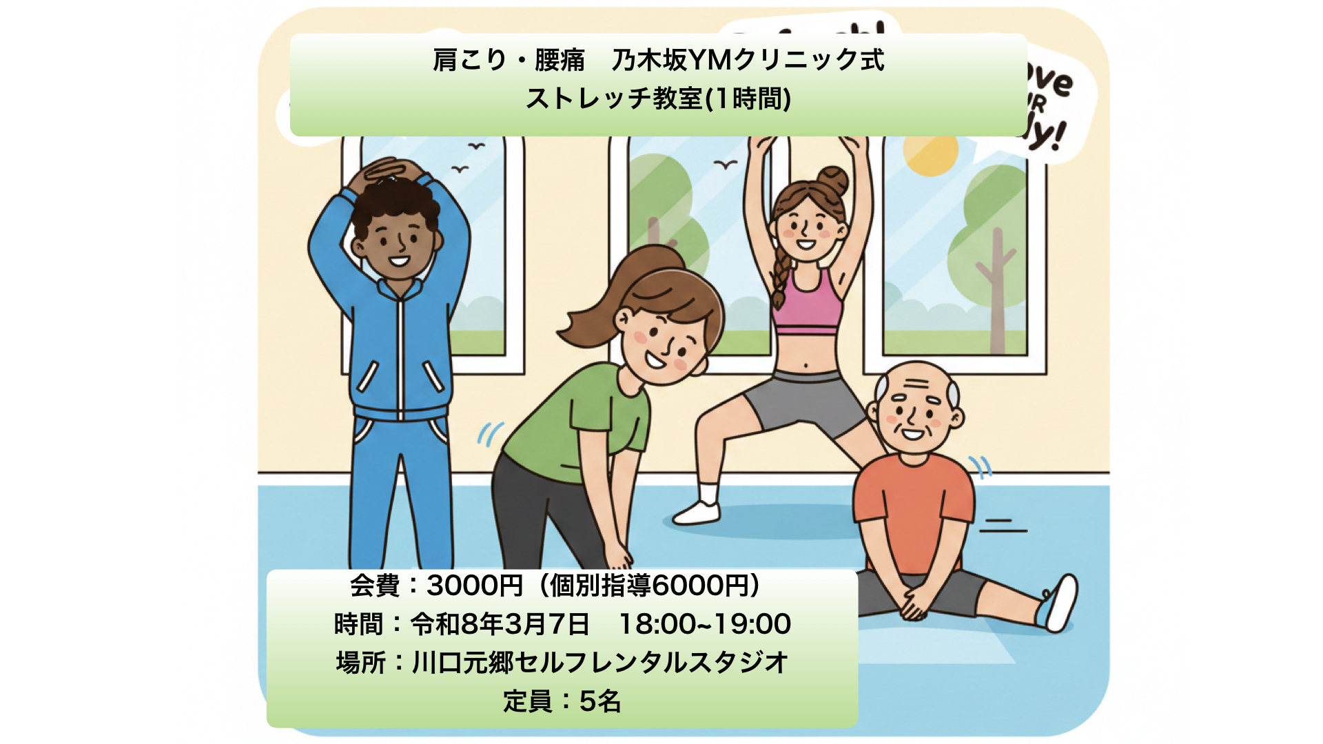 乃木坂YMクリニックにて日々難治性の肩こり腰痛患者様を治療している知見を元に、独自のストレッチ方法を考案しています。