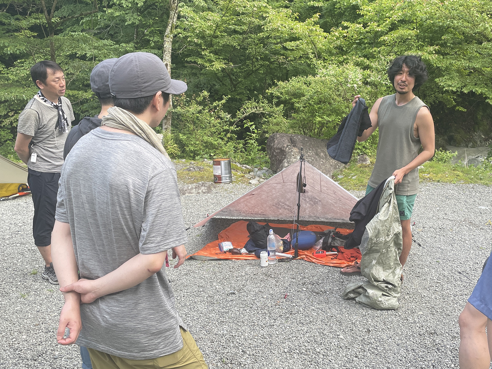 ULハイキングのノウハウをフィールドで実践的に学ぶことを目的とした本プログラムでは、ハイキングの距離はあえて短めに設定し、パッキングやウェアリングの検証、シェルターやクッキングツールの紹介などワークショップの時間を多く設けています。
