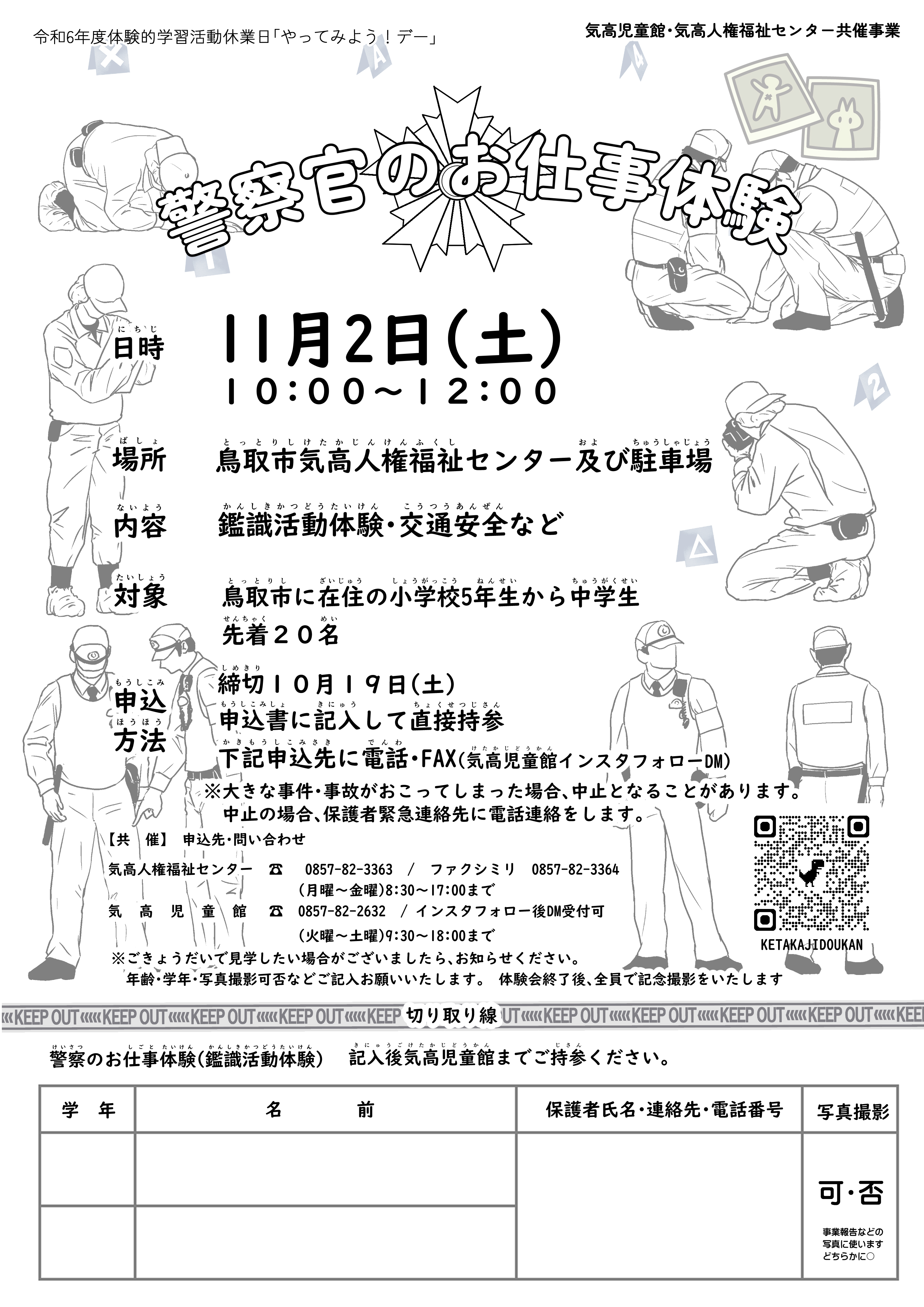 5・6年生(場合により4年生可)中学生以上(家族見学可能)警察車両見学だけでも参加可能です。(年齢不問)
