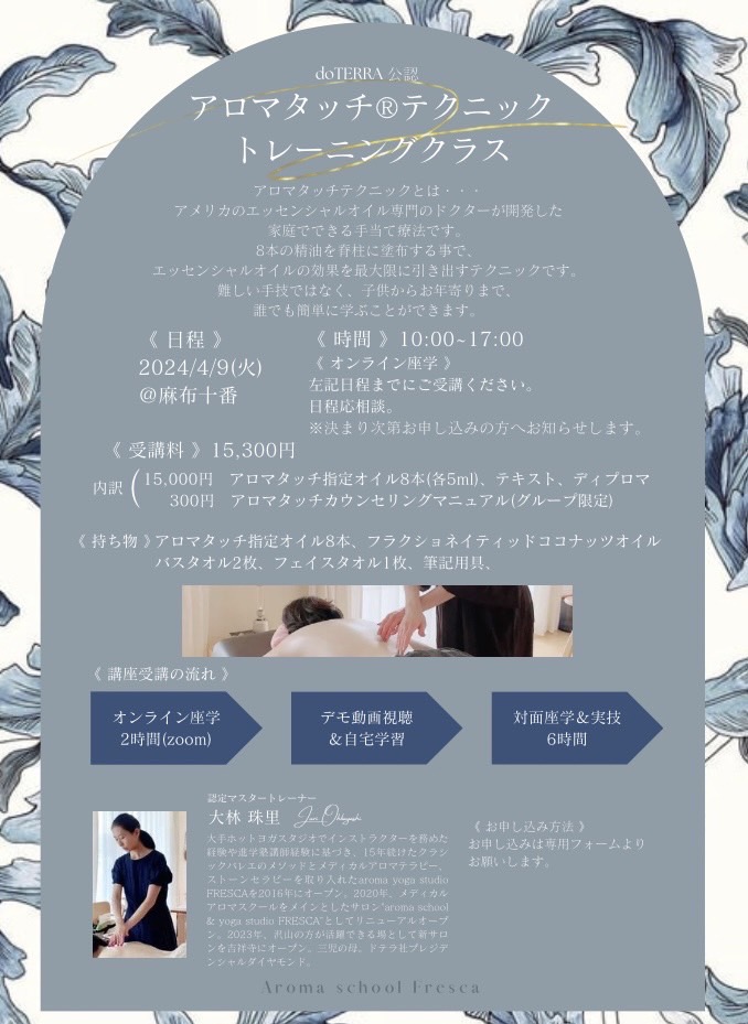 2020年、メディカルアロマスクールをメインとしたサロン"aroma school & yoga studio FRESCA"としてリニューアルオープン。アロマトリートメント、ストーンセラピーサロンも併設。三児の母。