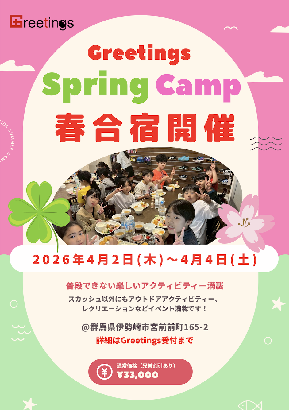 参加費:33,000円 (税込) (兄弟割引あり)(食費、宿泊費、コート使用料、コーチング料を含む)