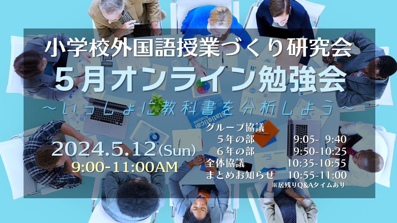 5月の授業について話し合いましょう。参加者の皆さんと一緒に、教科書を分析する勉強会です。同じ教科書ごとにブレイクアウトセッションを組み、協議を行っていきます。グループ協議が中心です。(※参加人数・状況によっては、当該教科書のグループが組めない場合もございます。)