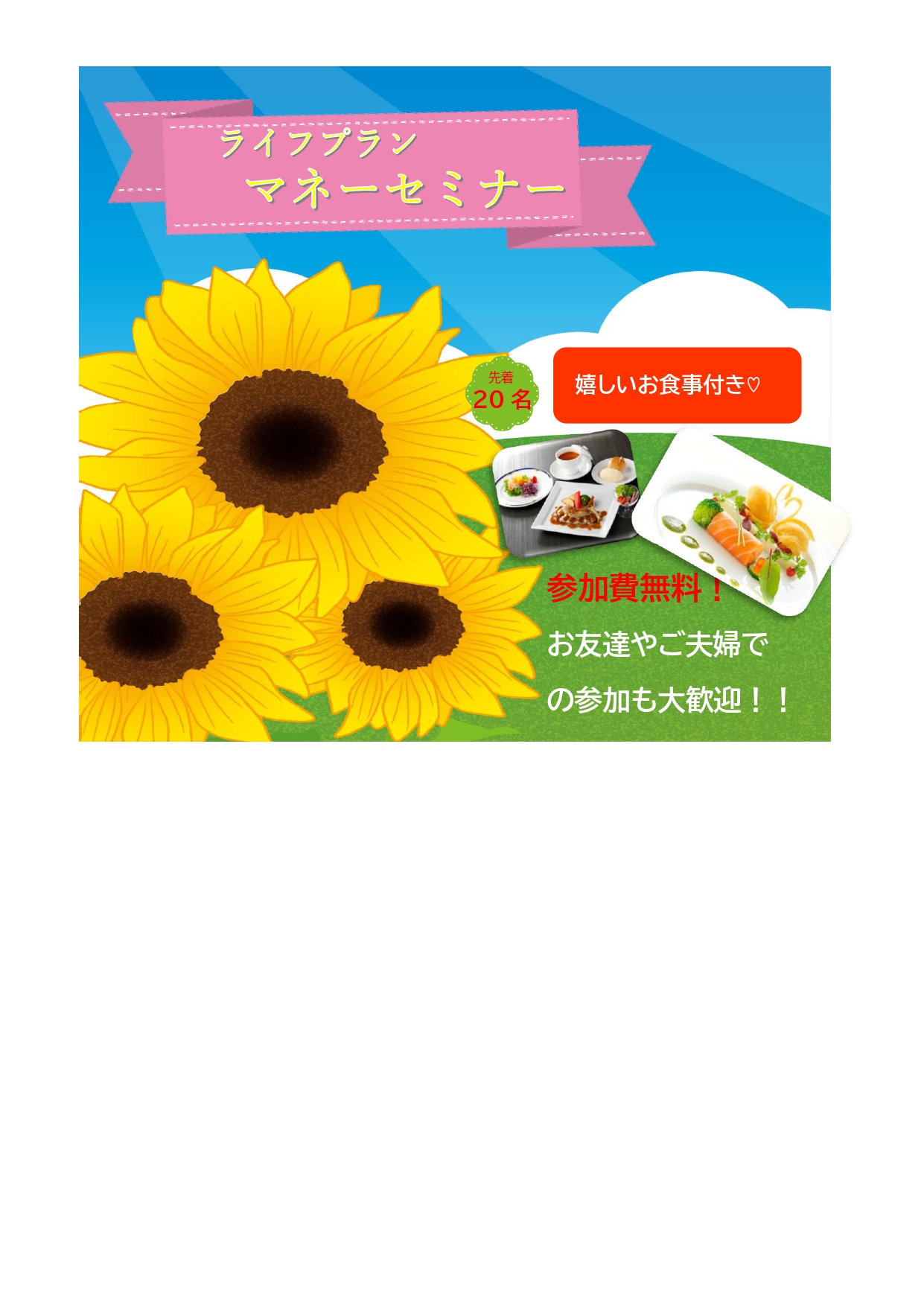 【個人情報の取扱いについて 】本セミナーは、株式会FPサンライズ(以下弊社)により運営されており、個人情報は弊社で管理いたします。ご入力いただきましたお客様の個人情報は弊社セミナー、商品サービスのご案内など弊社の利用目的の範囲内で利用させていただくことがございます。