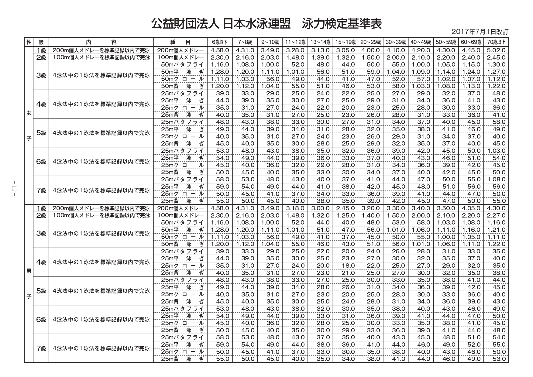 泳力検定は日本水泳連盟が創設した全国統一の泳力を認定する公式検定です。