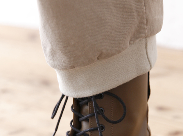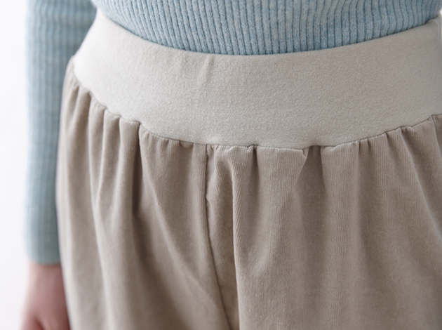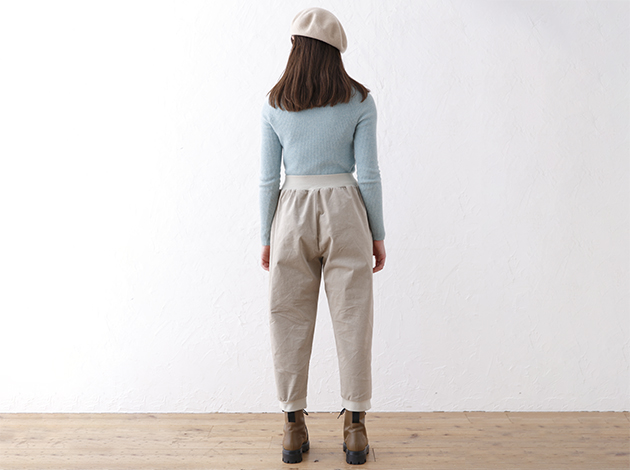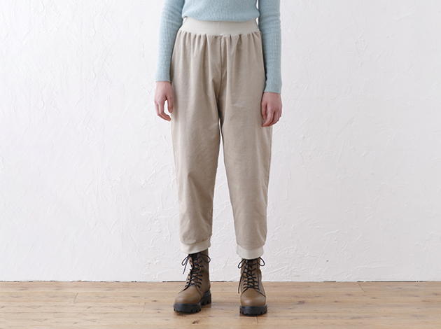 今年もコーデュロイのパンツは大人気!ストレッチ素材のコーデュロイとニット素材のリブを組み合わせて、かわいいエッグパンツを作ります。 後ろ姿は丸くてかわいいエッグシルエットなので腰まわりの体形をカバーしてくれます。ウエストと裾はリブ仕立て。ウエストには中にゴムを入れてフィット感を出しています。ニットパンツはリラックス感がありすぎても、こんなにしっかりしたコーデュロイの生地ならおしゃれな街着として大活躍。丸いフォルムと半端丈は、幅広い年齢層の方に似合いますよ。