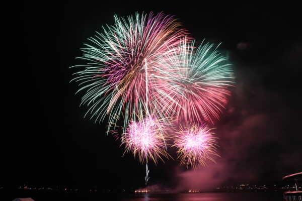 例年、エンターテインメント性の高い花火師の日本橋丸玉屋による花火が人気の花火大会です。 3台の台船から打ち上がる豪華な花火が海岸を鮮やかに照らします。