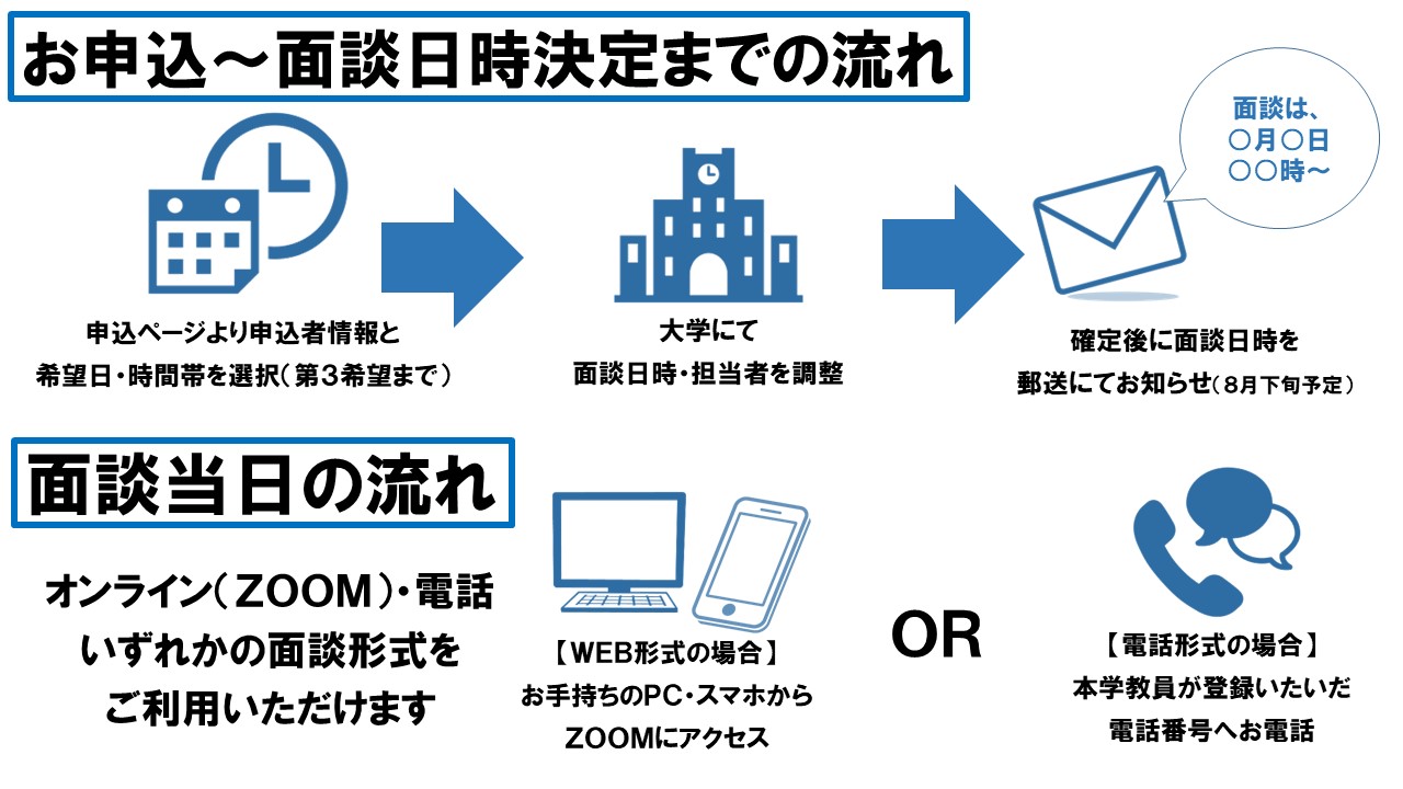 ●申込締切後、面談日時を大学で調整の上、8月下旬に郵送にてお知らせします。9月15日(金)を過ぎてもご自宅に通知が届かない場合は、崇城大学 庶務課までご連絡ください。なお、面談日時確定通知後(8月下旬予定)は、日時の変更ができませんので、予めご了承ください。