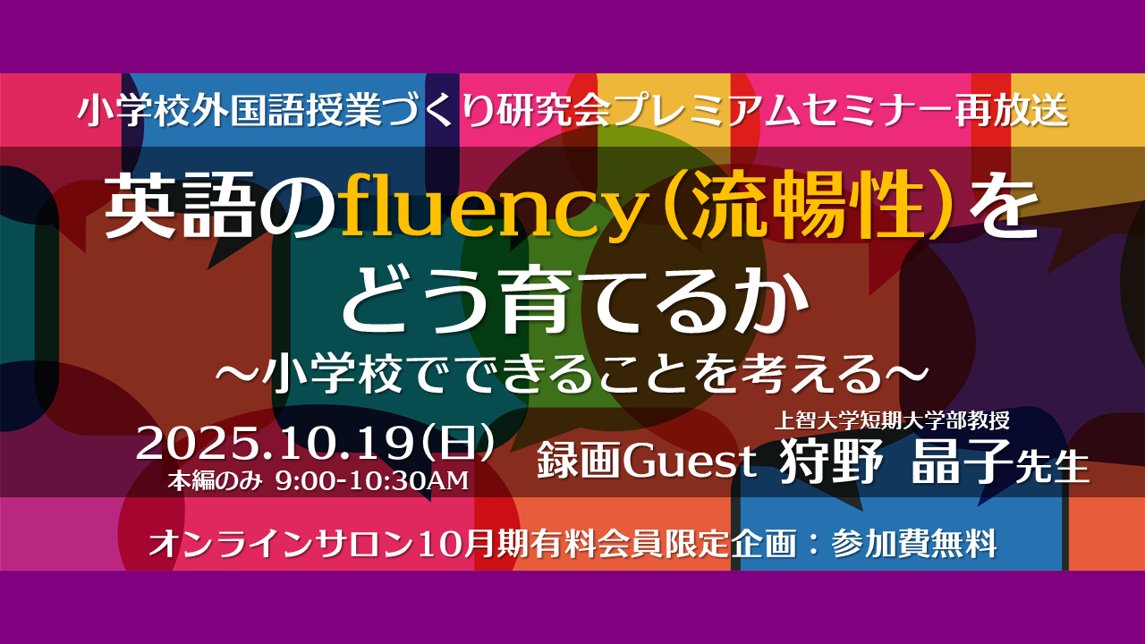 【再】小学校外国語授業づくり研究会プレミアムセミナー再放送「英語のfluency(流暢性)をどう育てるか~小学校でできることを考える」(録画ゲスト:上智大学短期大学部教授 狩野晶子先生)
