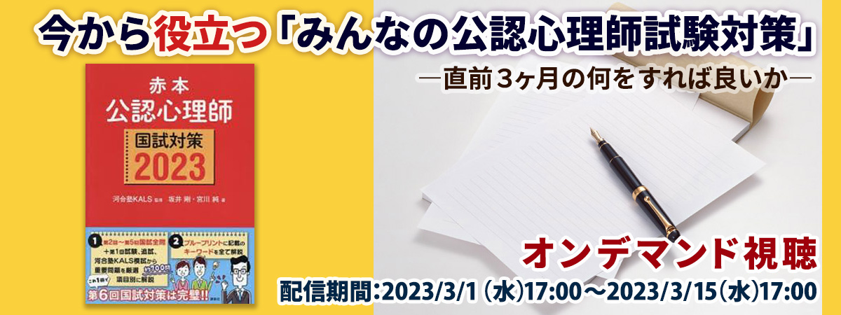 そこで、臨床心理iNEXTは、受験生を応援する研修会「今から役立つ「みんなの公認心理師試験対策」を開催することとしました。公認心理師試験対策で評価の高い河合塾K ALSの人気講師で、受験生のバイブルとも言える「赤本 公認心理師試験対策2023」