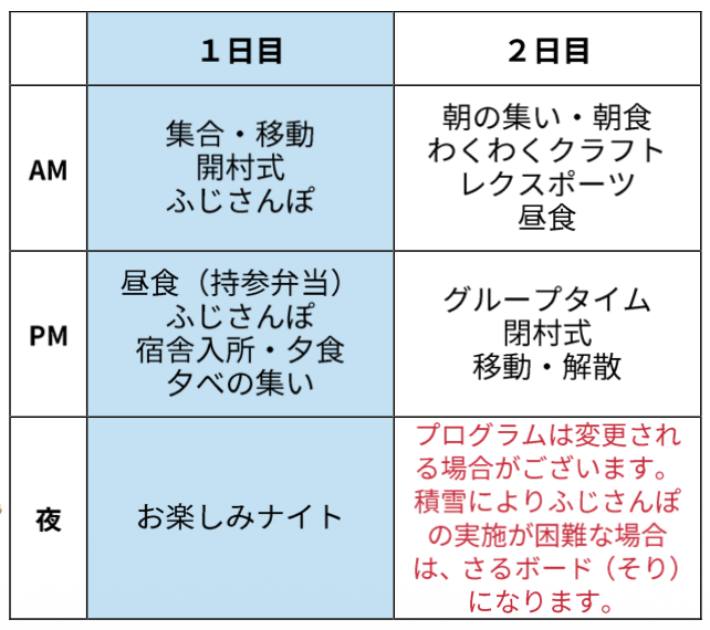 - 本サイトに示されている時間は暫定的なものです。今後しおりで正式な集合・解散時間をお知らせします。