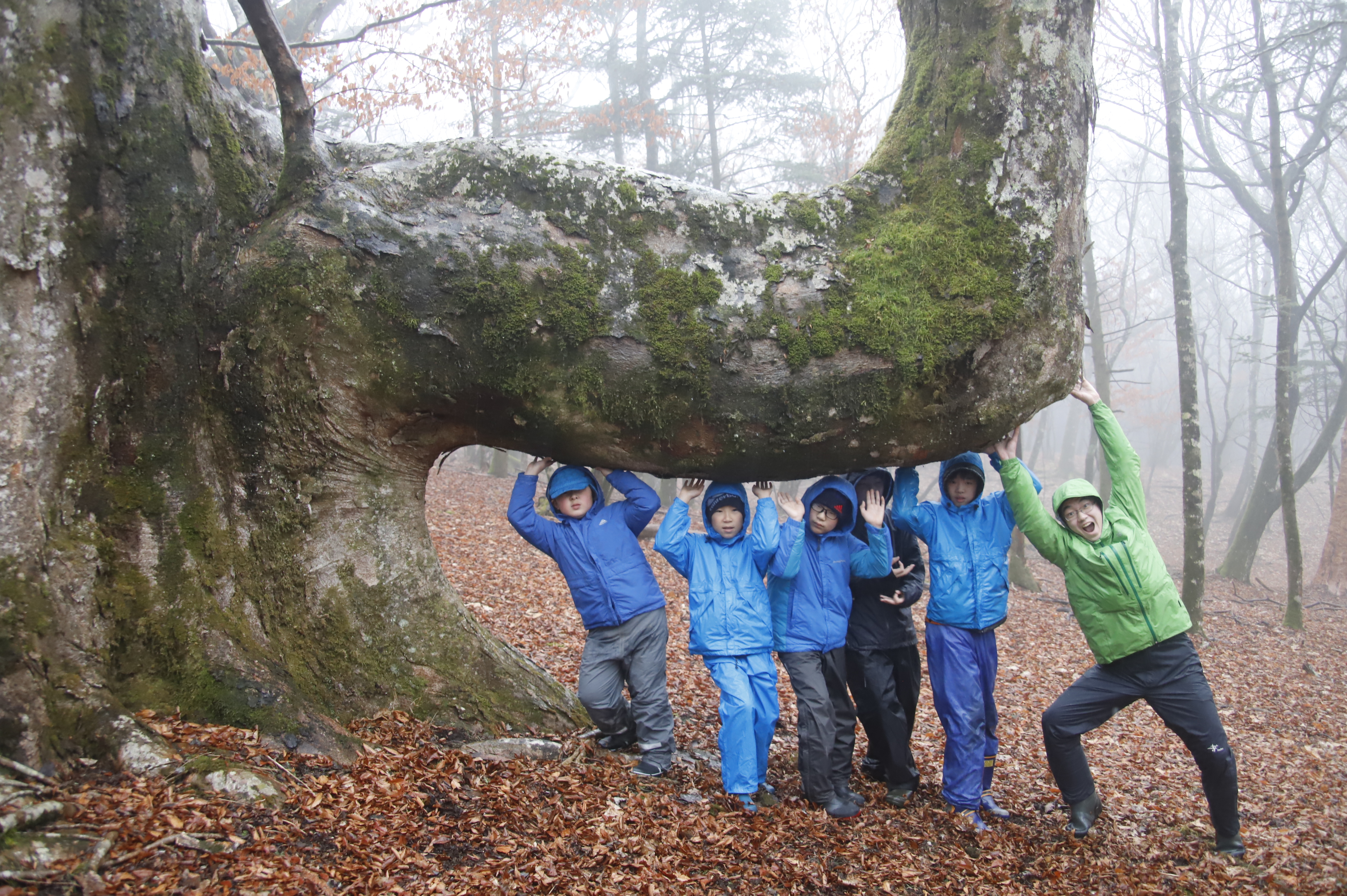 「ふじさんぽ」では、フカフカに落ち葉の散り敷いた明るい森をお散歩します。コース途中には、かくれんぼをしている”あの人”たちを探す広場や、苔むした溶岩流の上を歩いたりするところもあります。
