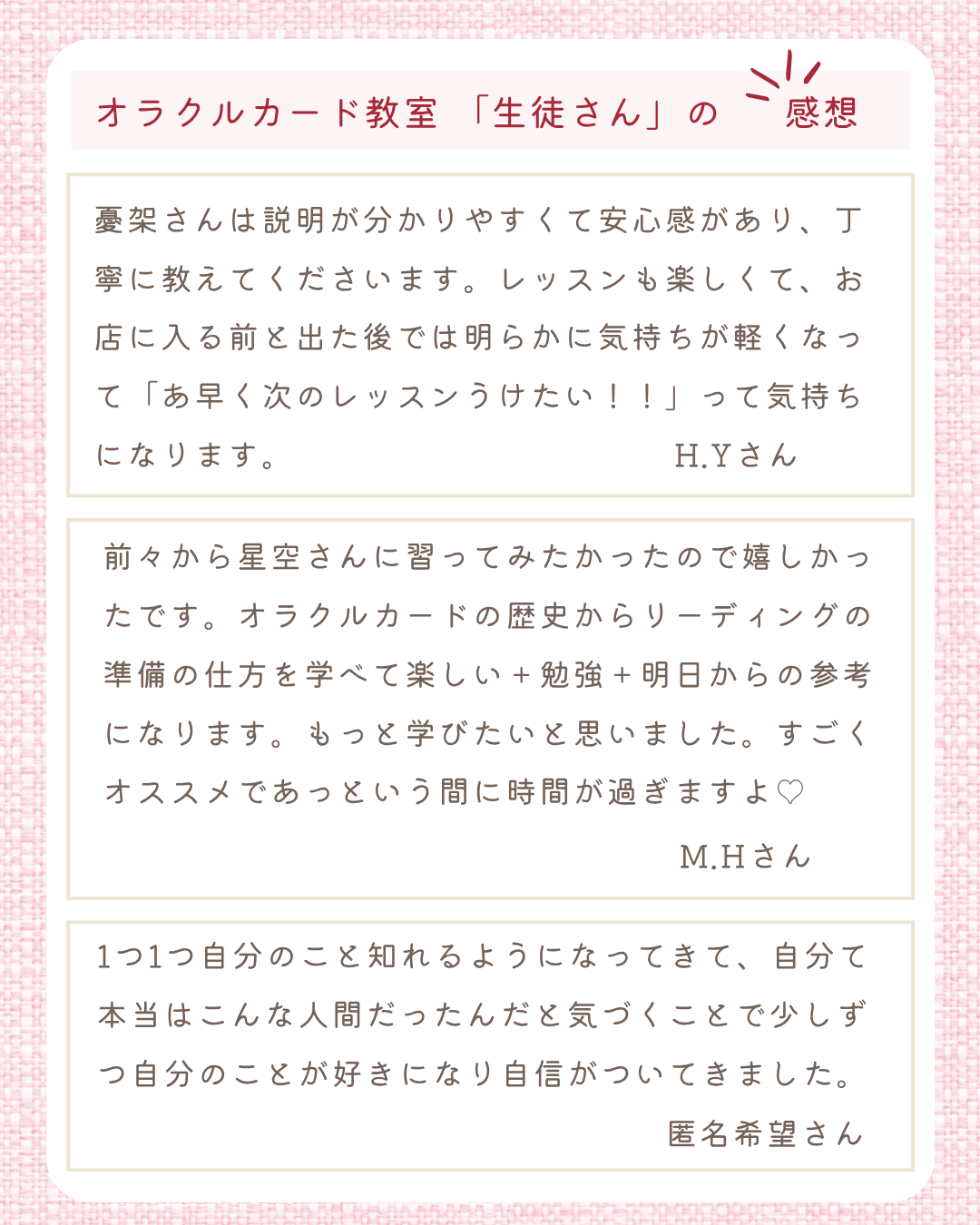★ オラクルカード(既にお持ちの方)※ 貸出用のカードがございますので、カードがなくても楽しく受講していただけます。