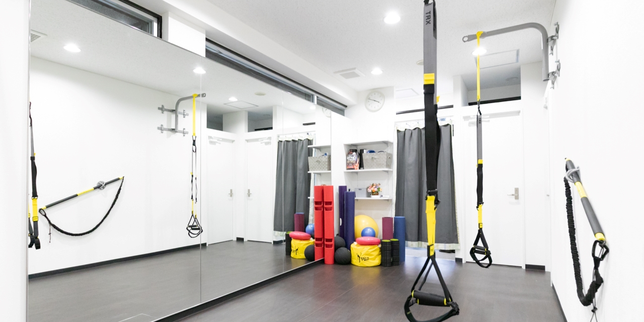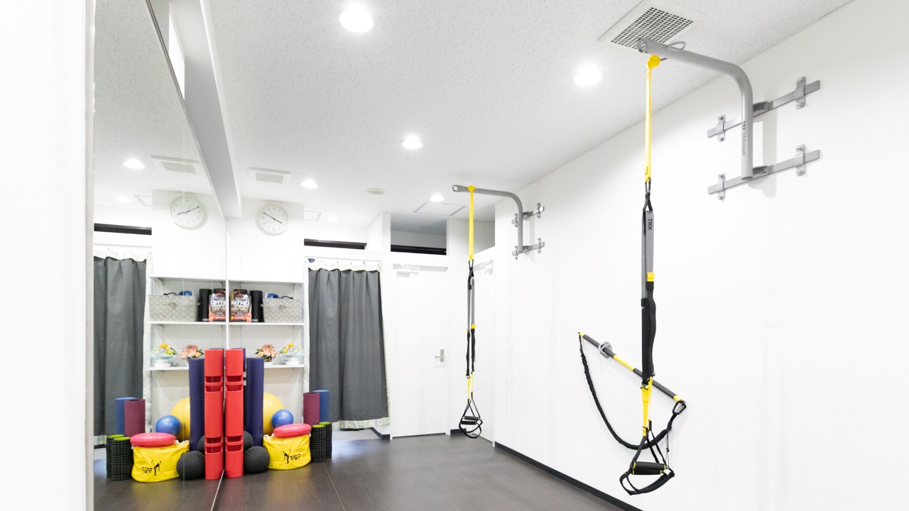 特殊加工した接地感覚が優しい床と大きな鏡、ユニークなトレーニングアイテムが特徴なパーソナルトレーニングスタジオです