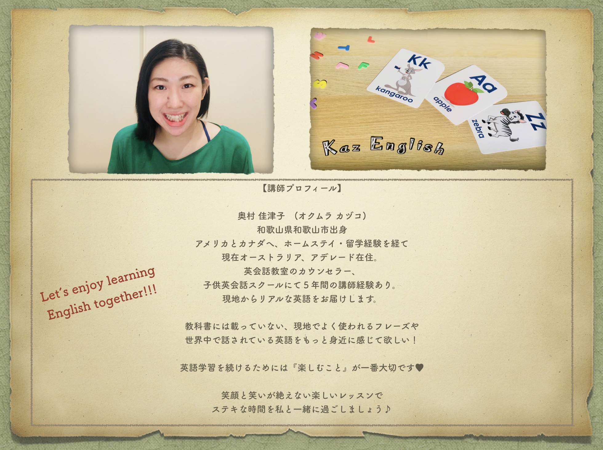 | 店舗・企業名 | Kaz English (講師:奥村 佳津子) |