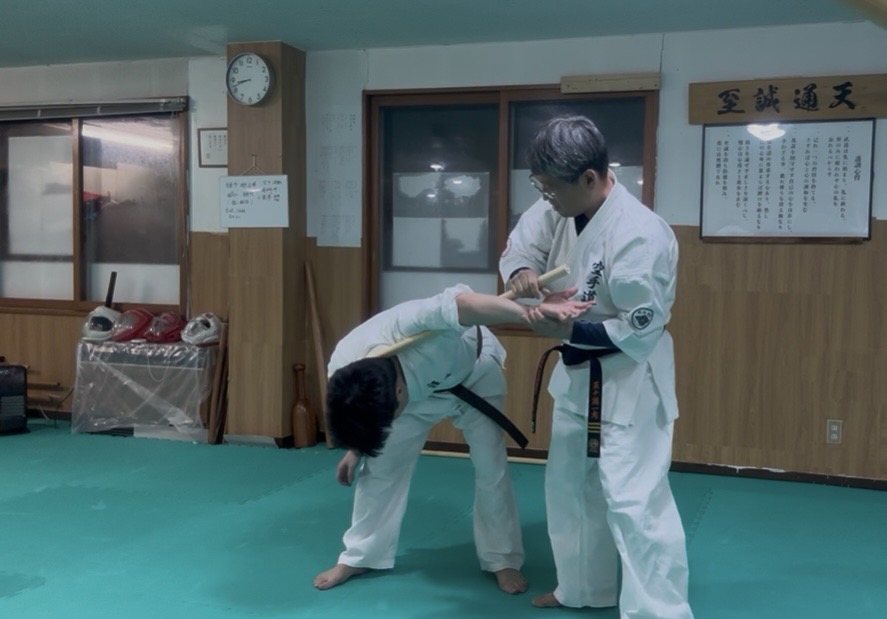 合気古武道柔法、逆手柔術、武器術の半棒術を練ります。