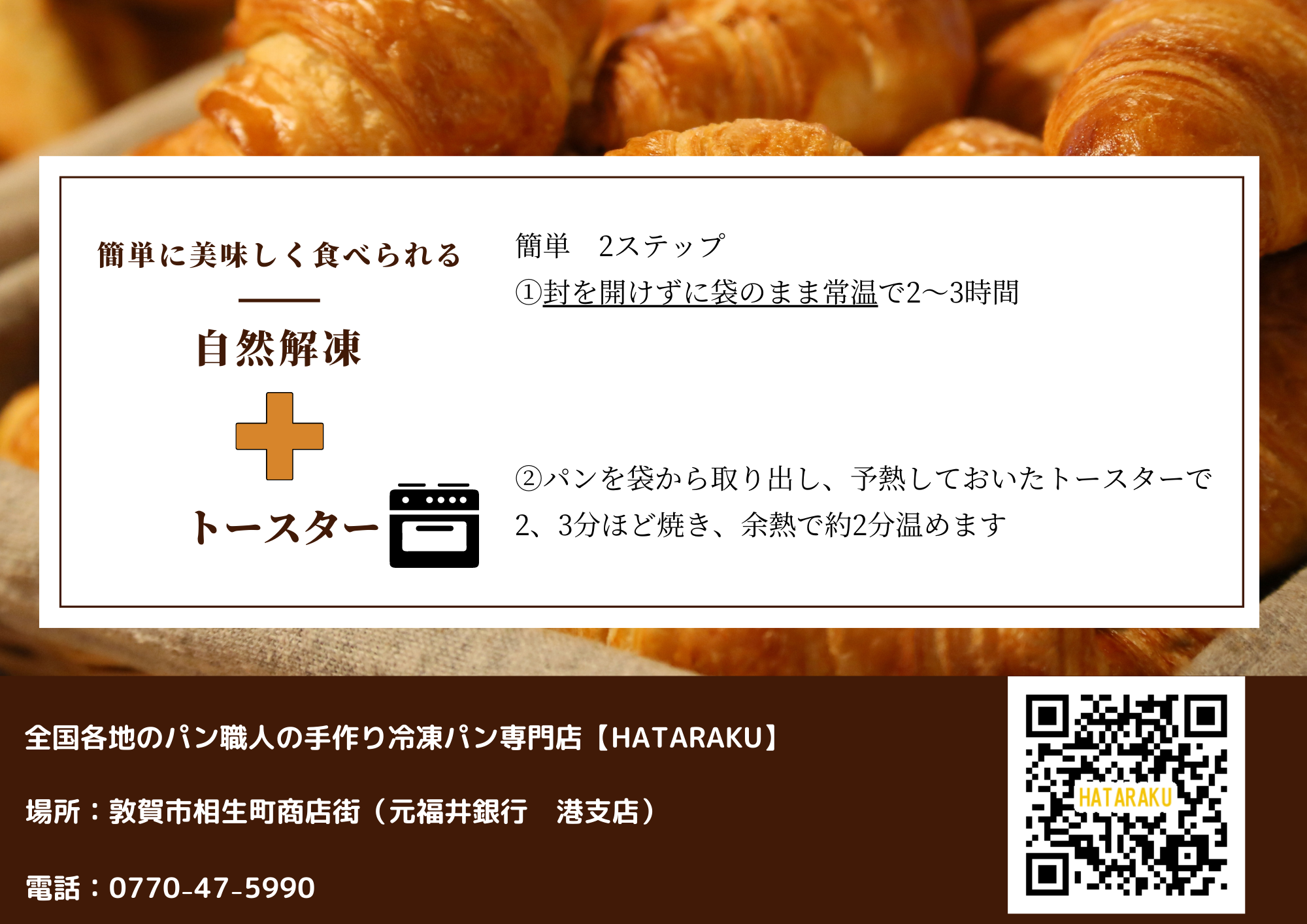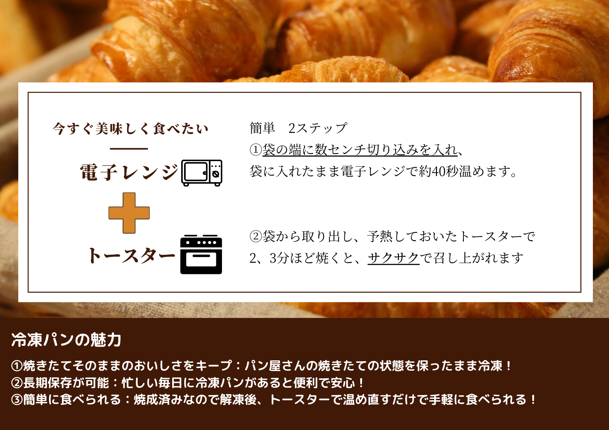 焼成済みのパンなので、自然解凍後、トースターで温め直すだけで手軽に食べられます。