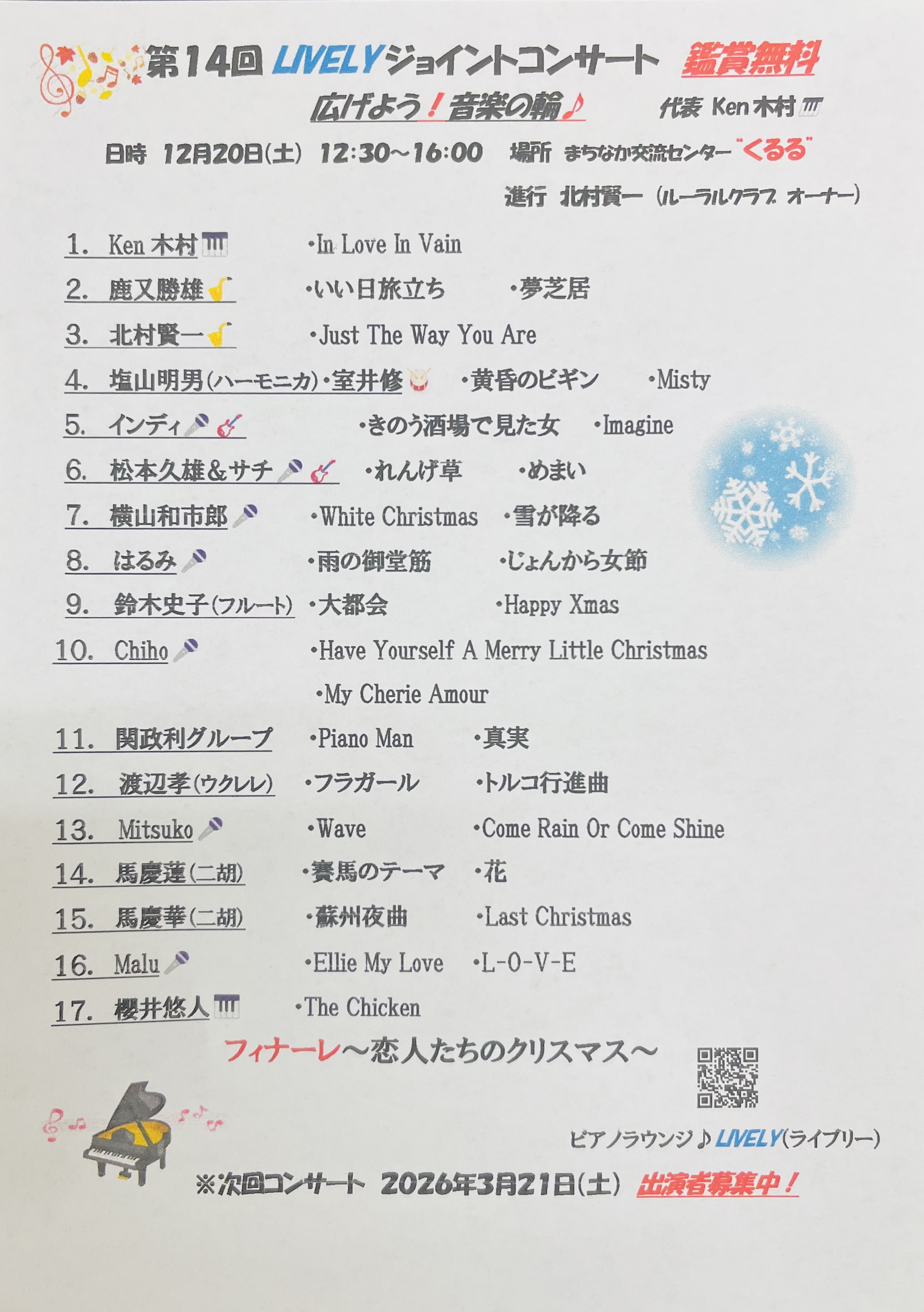 ・12月20日(土)に「くるる」で開催します。17組のグループが出演します♪