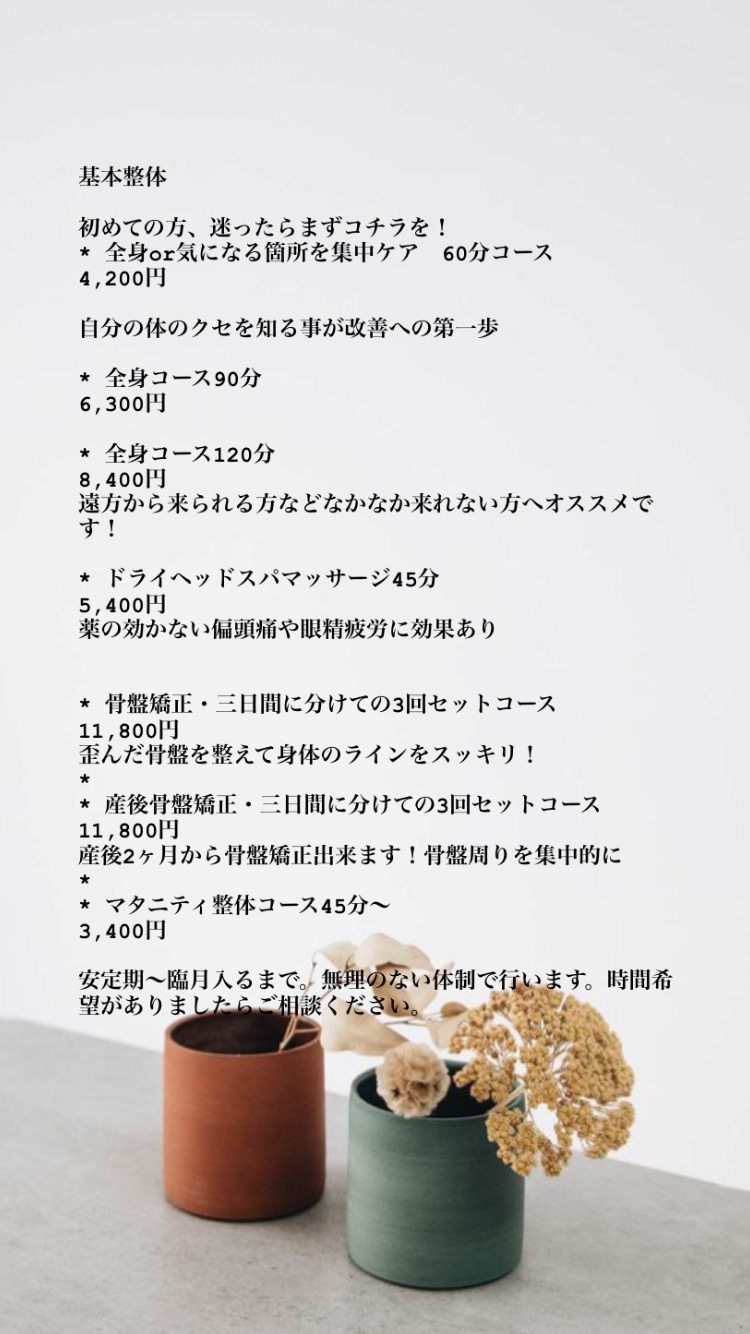 | 営業時間 | 10:00 ~ 19:00 (最終受付 17:00)完全予約制・施術中に電話に出れない事もありますが、必ず折り返しお電話致します。 |