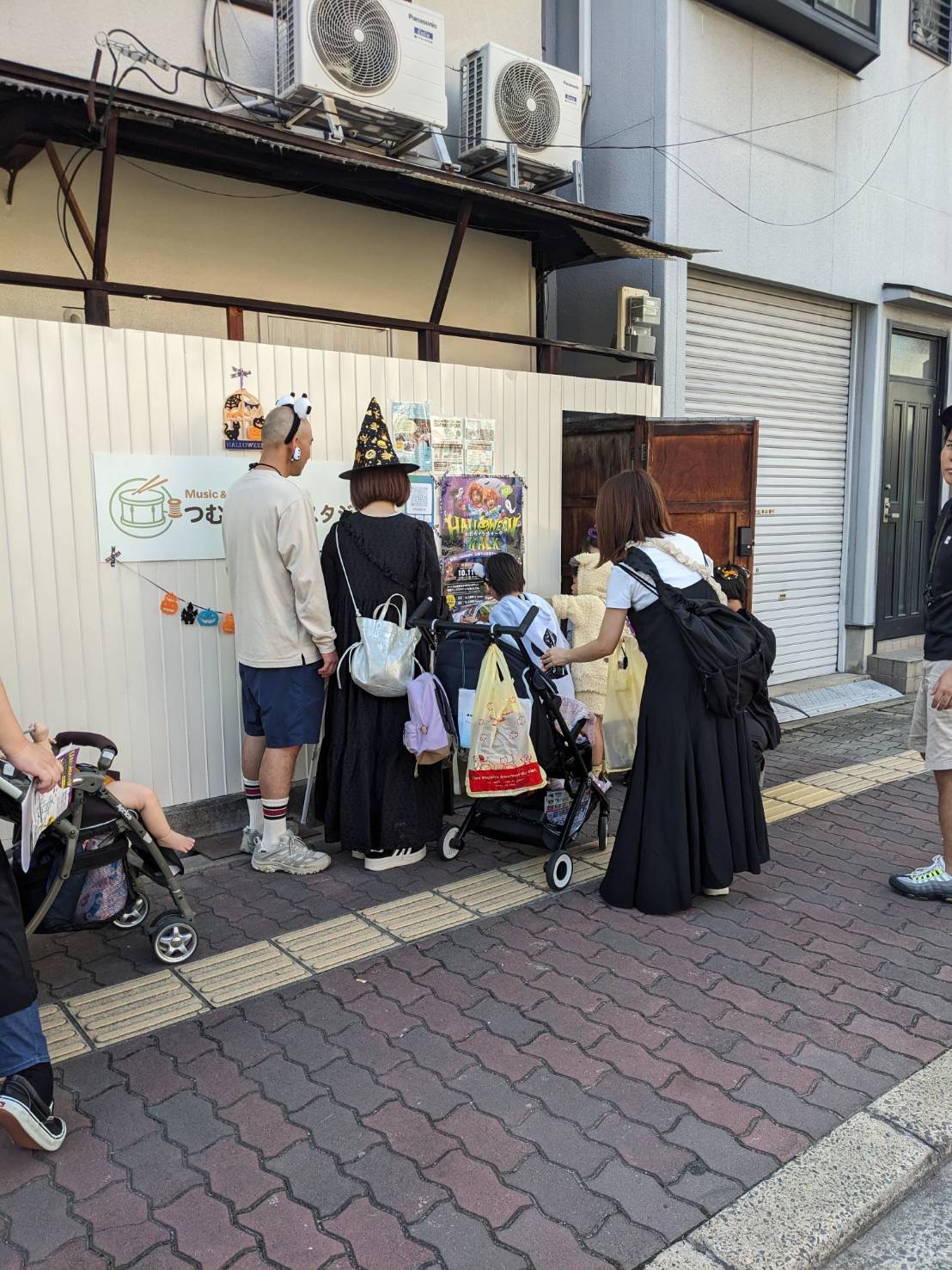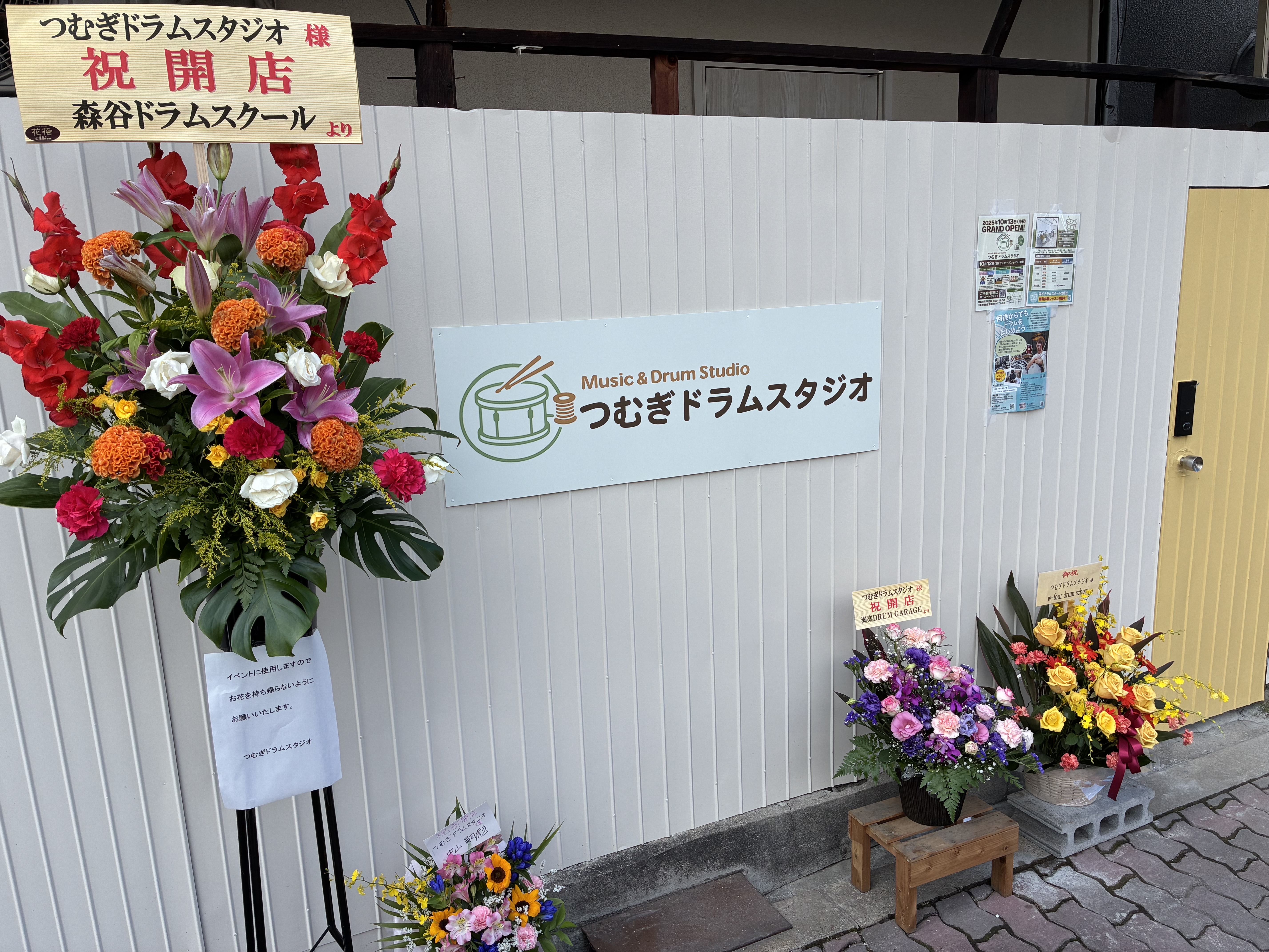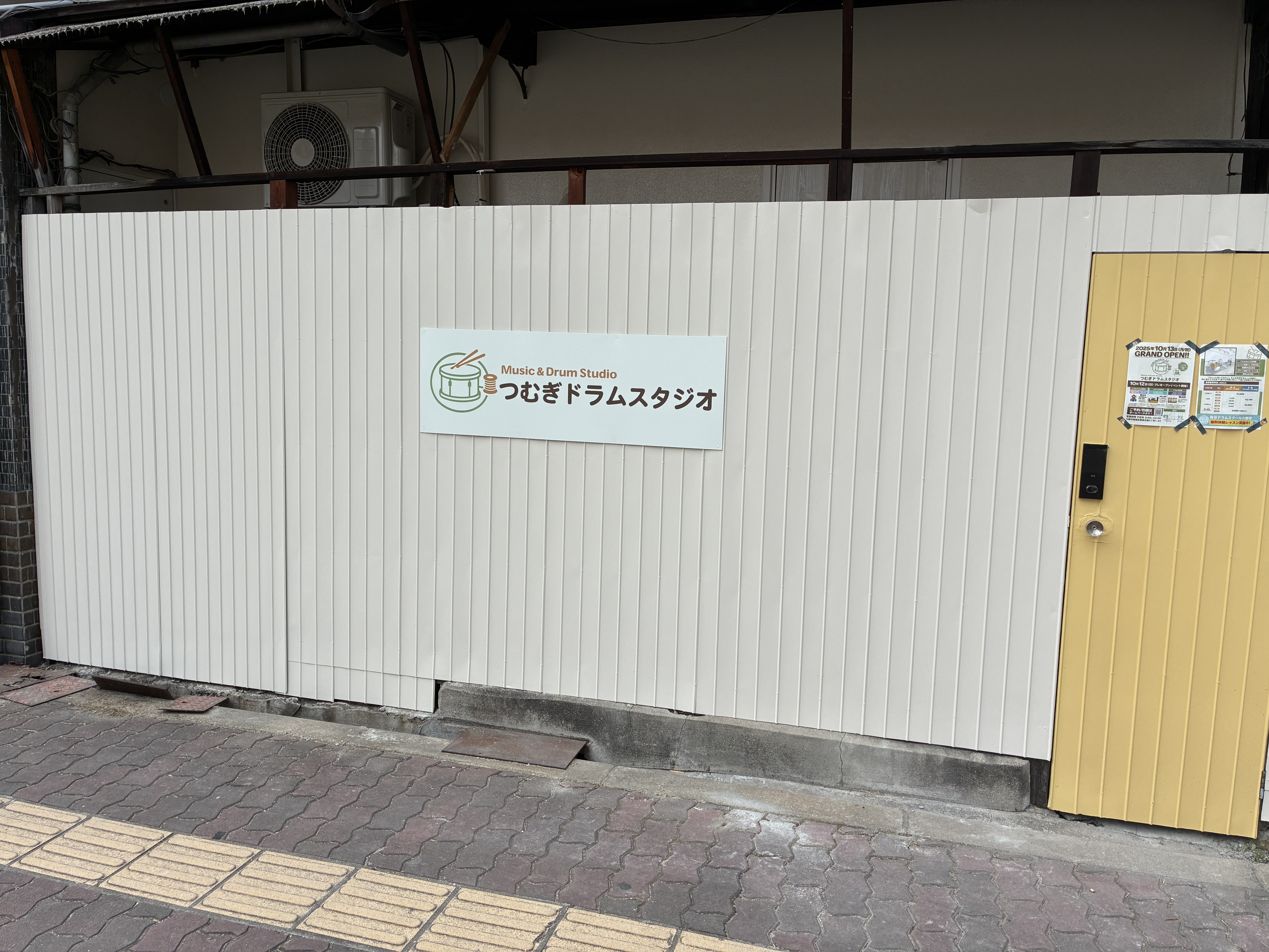 都島駅5番出口を左に曲がり、大通り沿いに野江内代駅方面(東)へ進みます。ENEOSの前の通りを左に曲がるとすぐつむぎドラムスタジオの看板と黄色の扉があります。