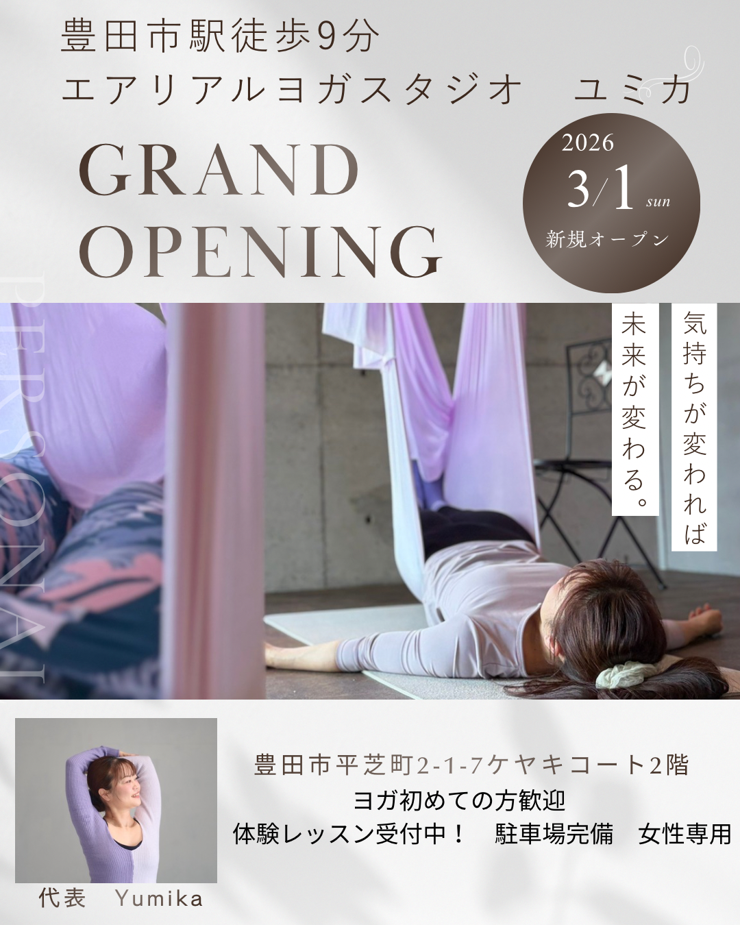 私は皆さまに健康と元気をお届けさせていただきたく、この度スタジオをオープンする運びとなりました。