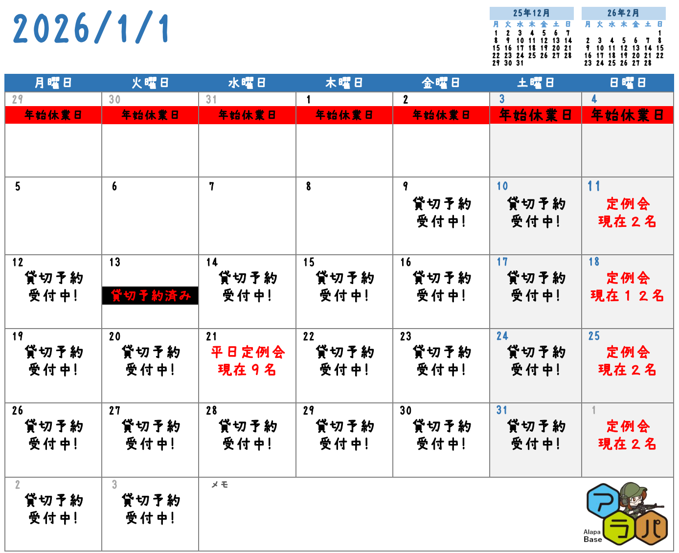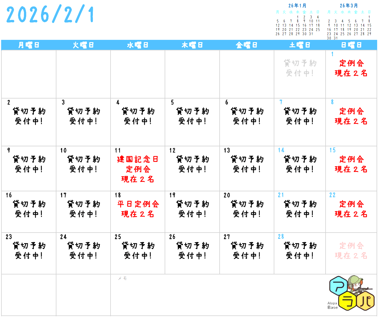 定例会を開催していない日は貸切対応させていただきます。(最低人数平日6名~、10名以上でゲーマス対応いたします。土日祝日10名~、16名以上でゲーマス対応いたします。貸切可能日など詳細につきましては最下部のお問い合わせからお願いします。また人数が少ない場合もご相談ください。)