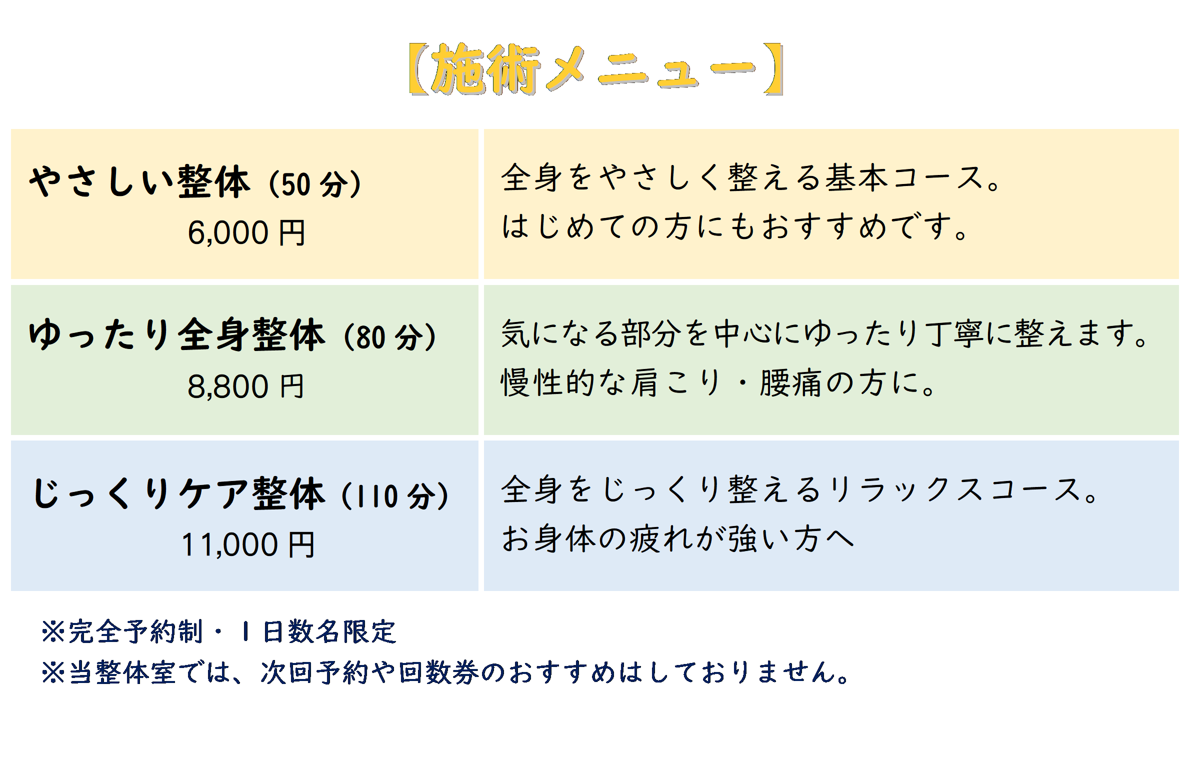 【やさしい整体 髙橋整体室】では『六層連動操法』によるやさしい整体をしています。 痛い施術が苦手な方、整体が初めてで不安な方も、どうぞ安心してお越しください。お一人おひとりのお身体に合わせて、ゆっくり丁寧に整えていきます。 小さな整体室ですので、1日数名のみゆったりと施術しています。 『六層連動操法』が気になっている方も ご存じない方も、是非一度 お試しください。