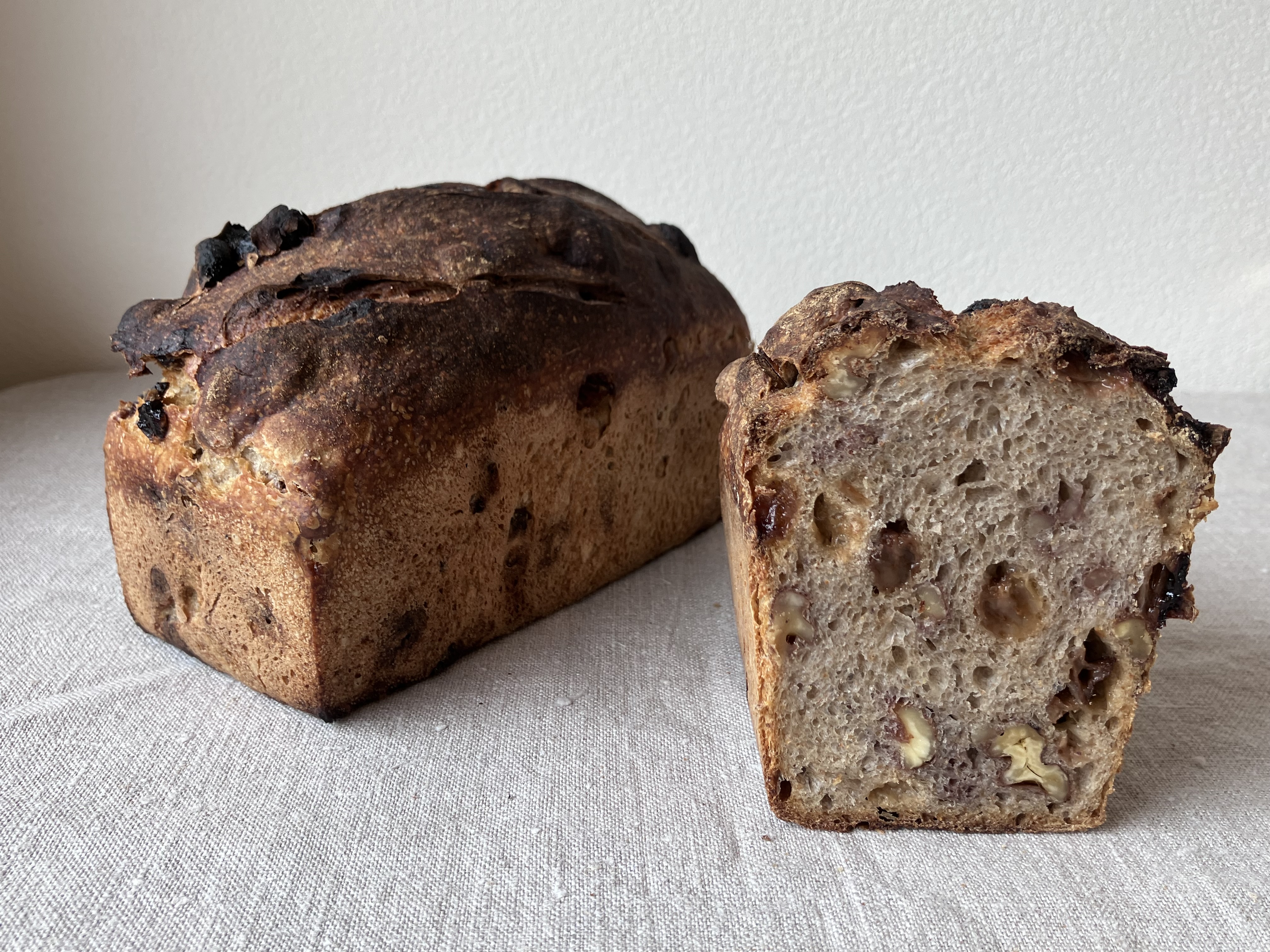 ノアレザン〈1個〉1640円税込 〈1/2〉820円ぜい □原材料・有機小麦全粒・有機ふすま・自然栽培ライ麦全粒粉(北海道)・発酵種・有機レーズン・有機クルミ(アメリカ)・発酵種・塩(フランス)