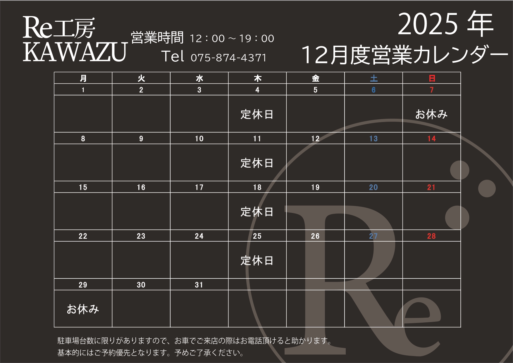 2025年12月の営業予定