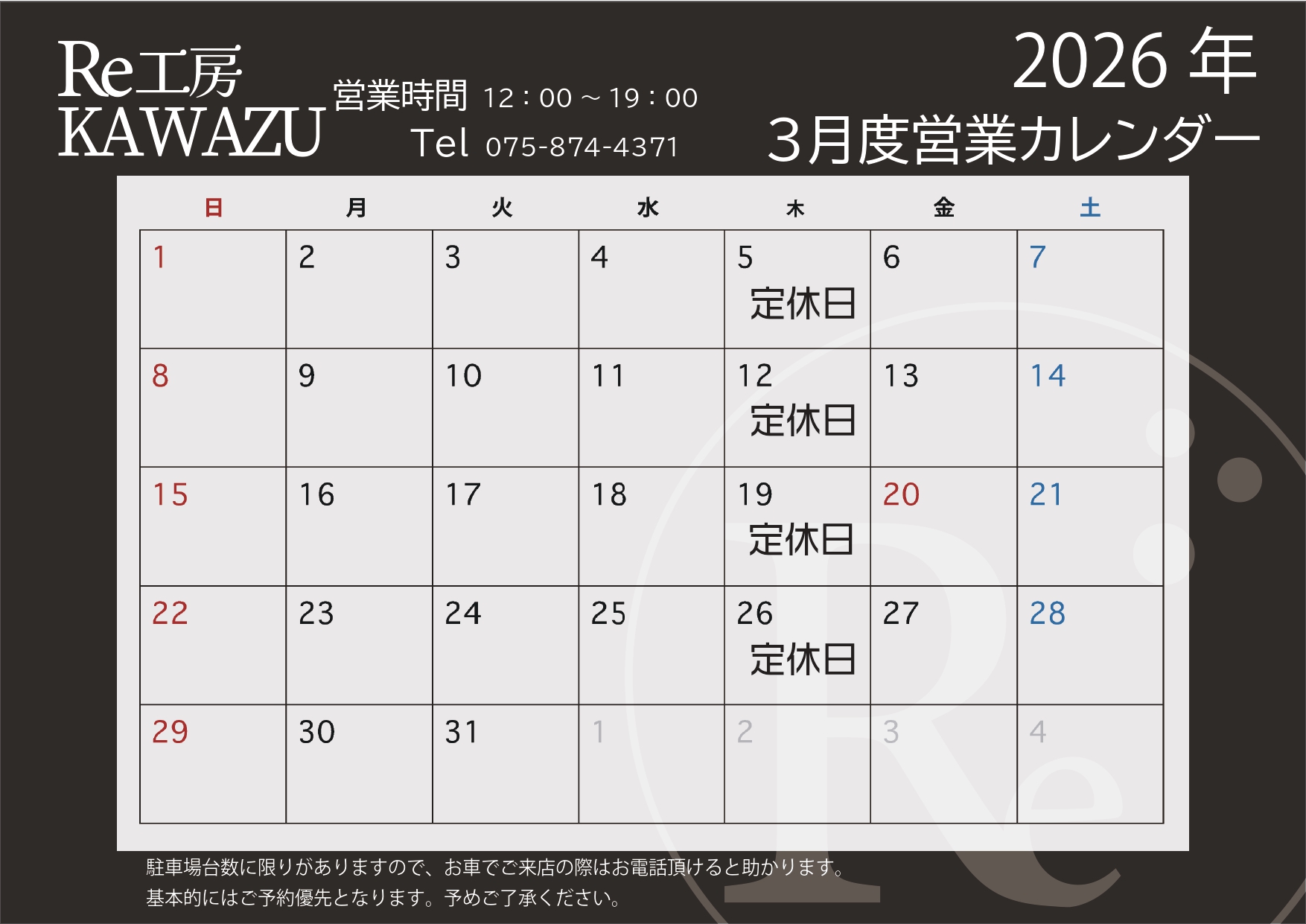 2026年3月の営業予定