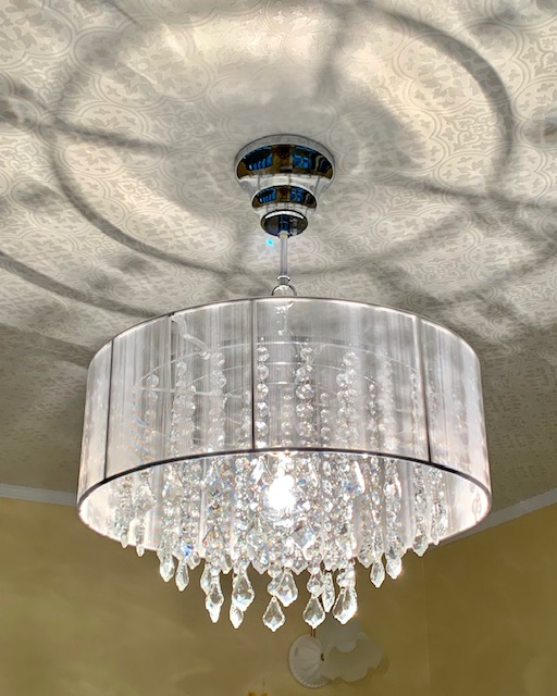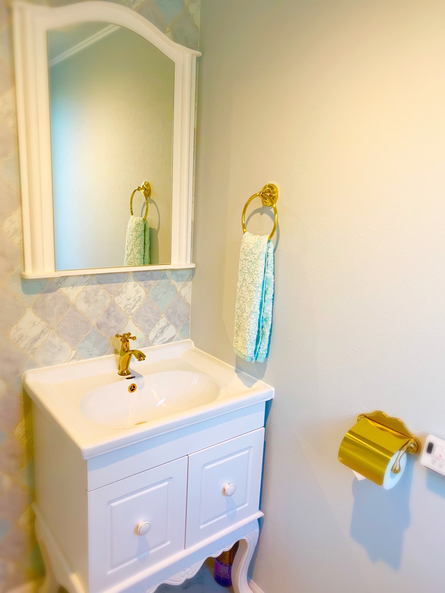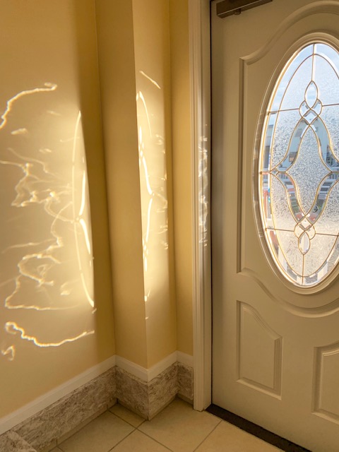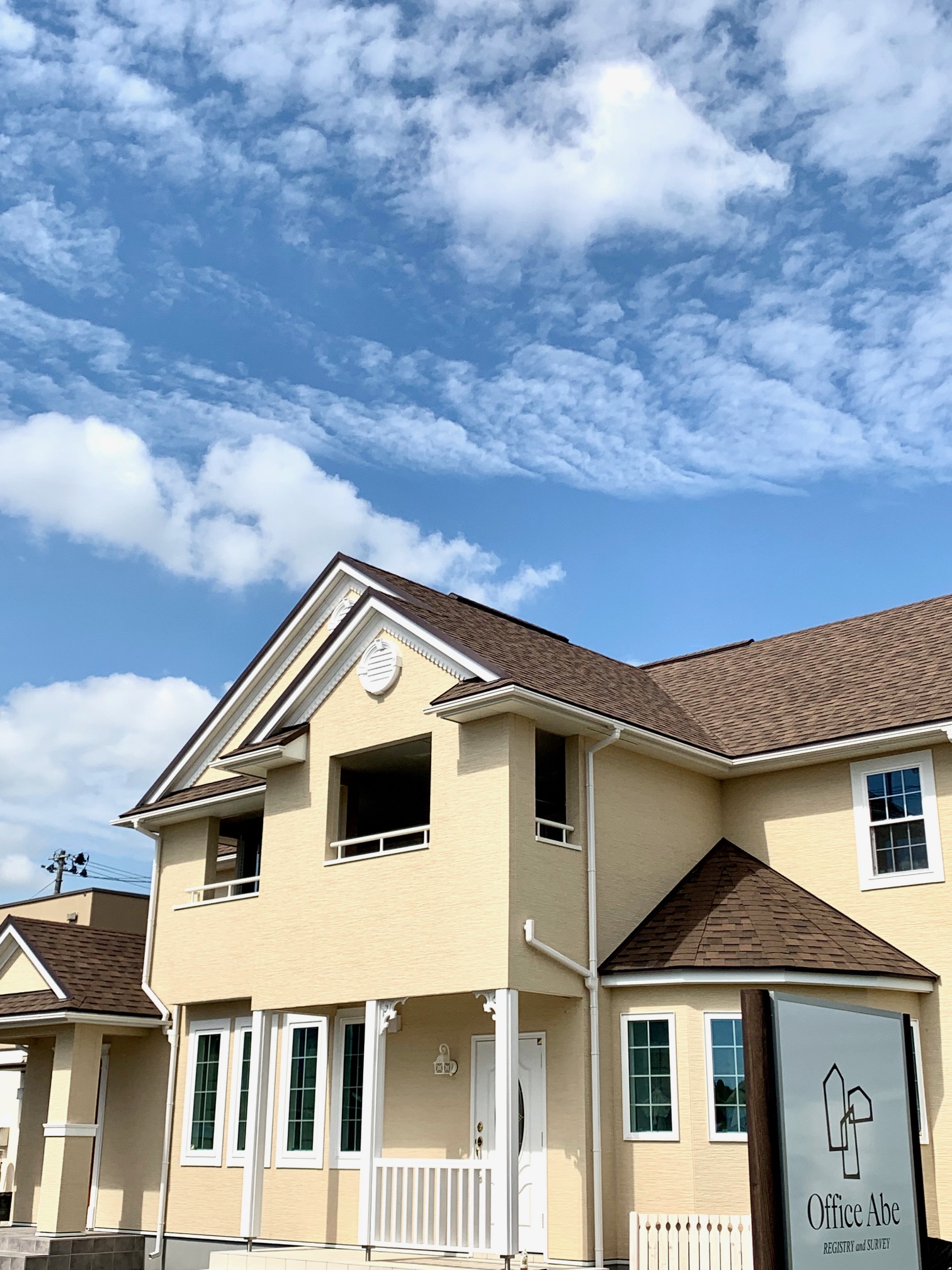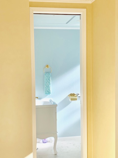 黄色い壁の輸入住宅1F、白いドアがサロンの入り口です