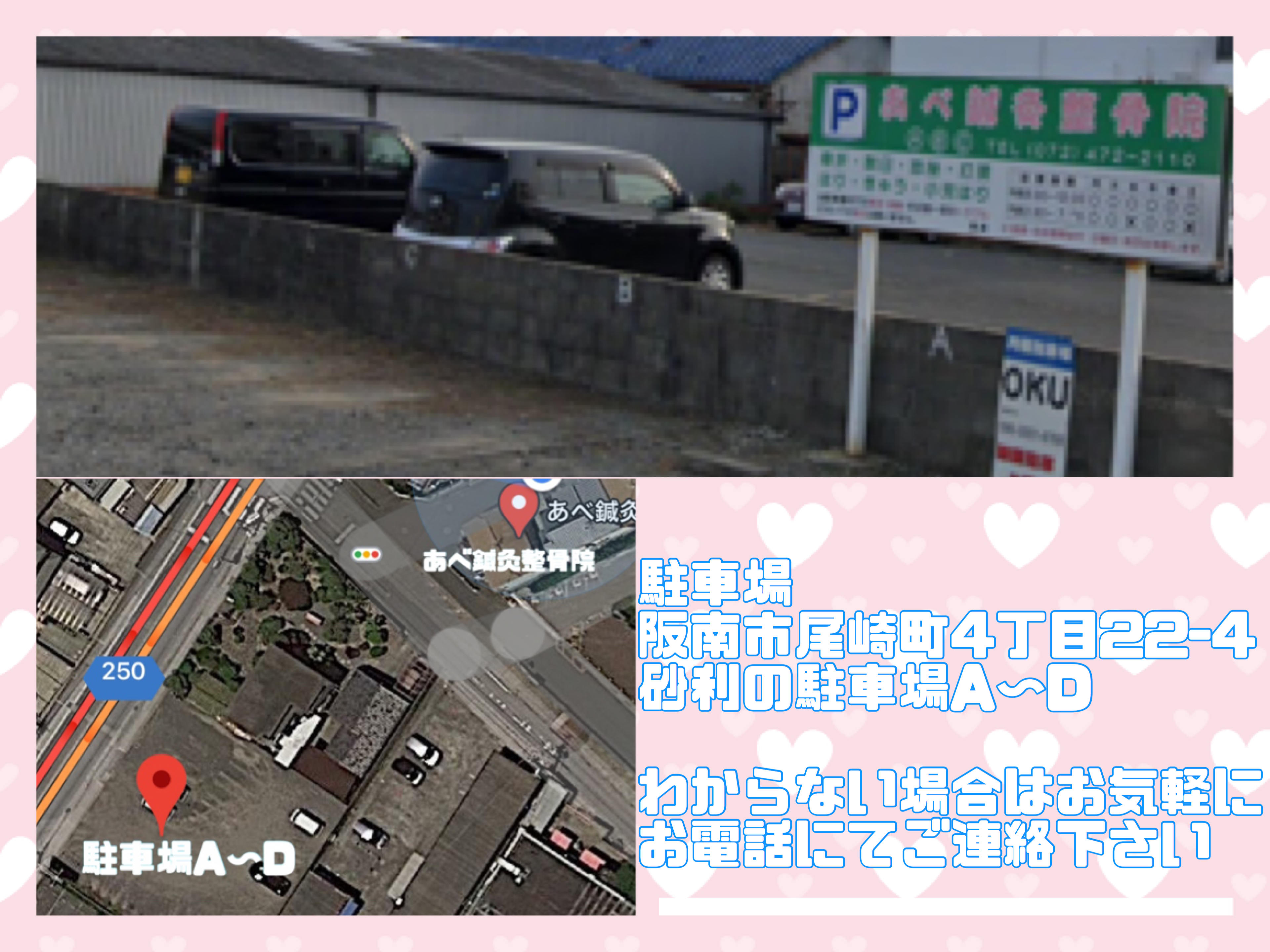 駐車場 (大阪府阪南市尾崎町4丁目22-4付近) 和歌山方面からお越しの方 尾崎団地前交差点の手前の右手にある砂利駐車場A〜D 大阪方面からお越しの方 尾崎団地前交差点を超えた左手にある砂利駐車場A〜D