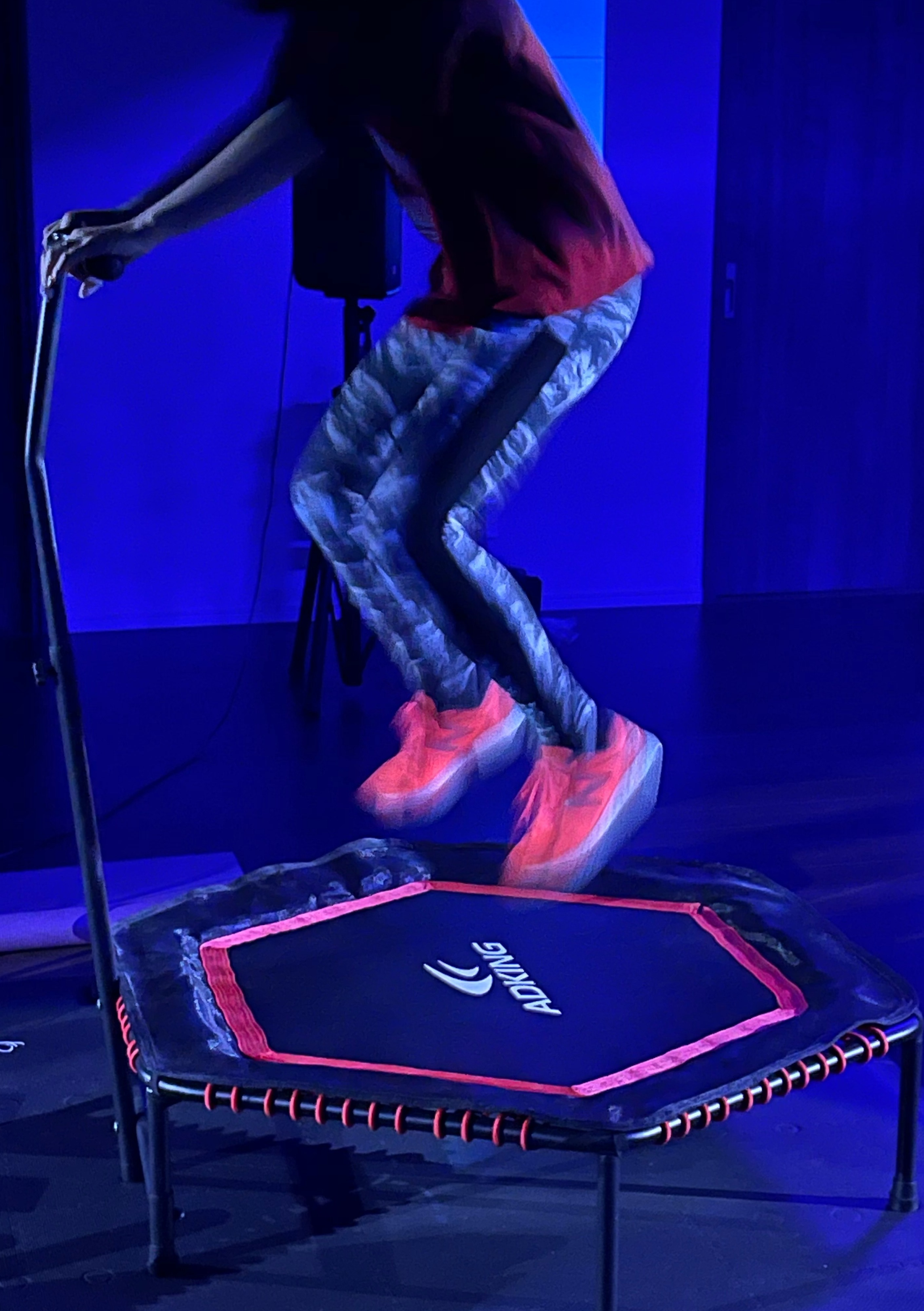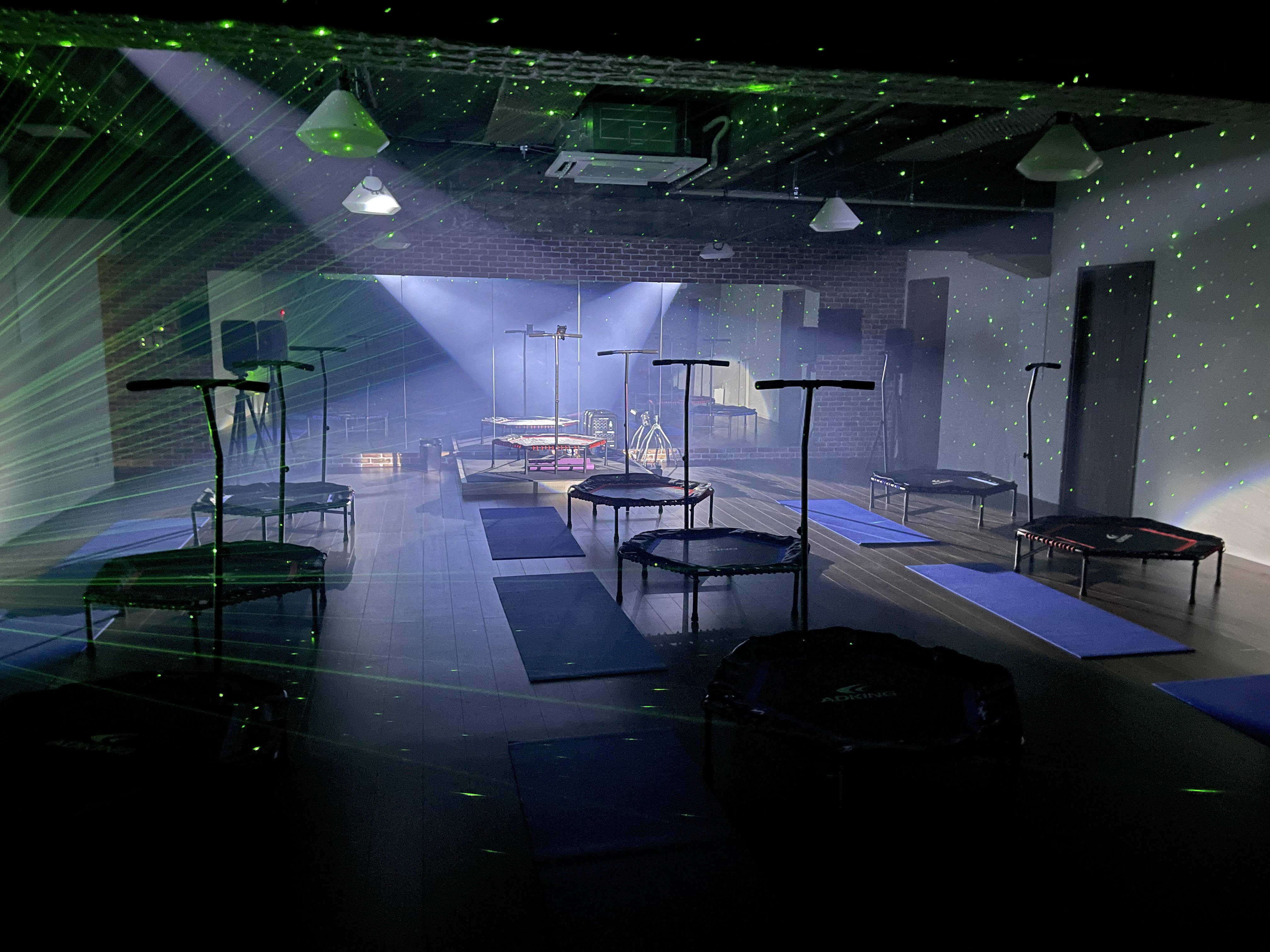 トランポリンに乗って非日常空間の中、音楽に合わせて楽しみながら簡単ステップでエクササイズ