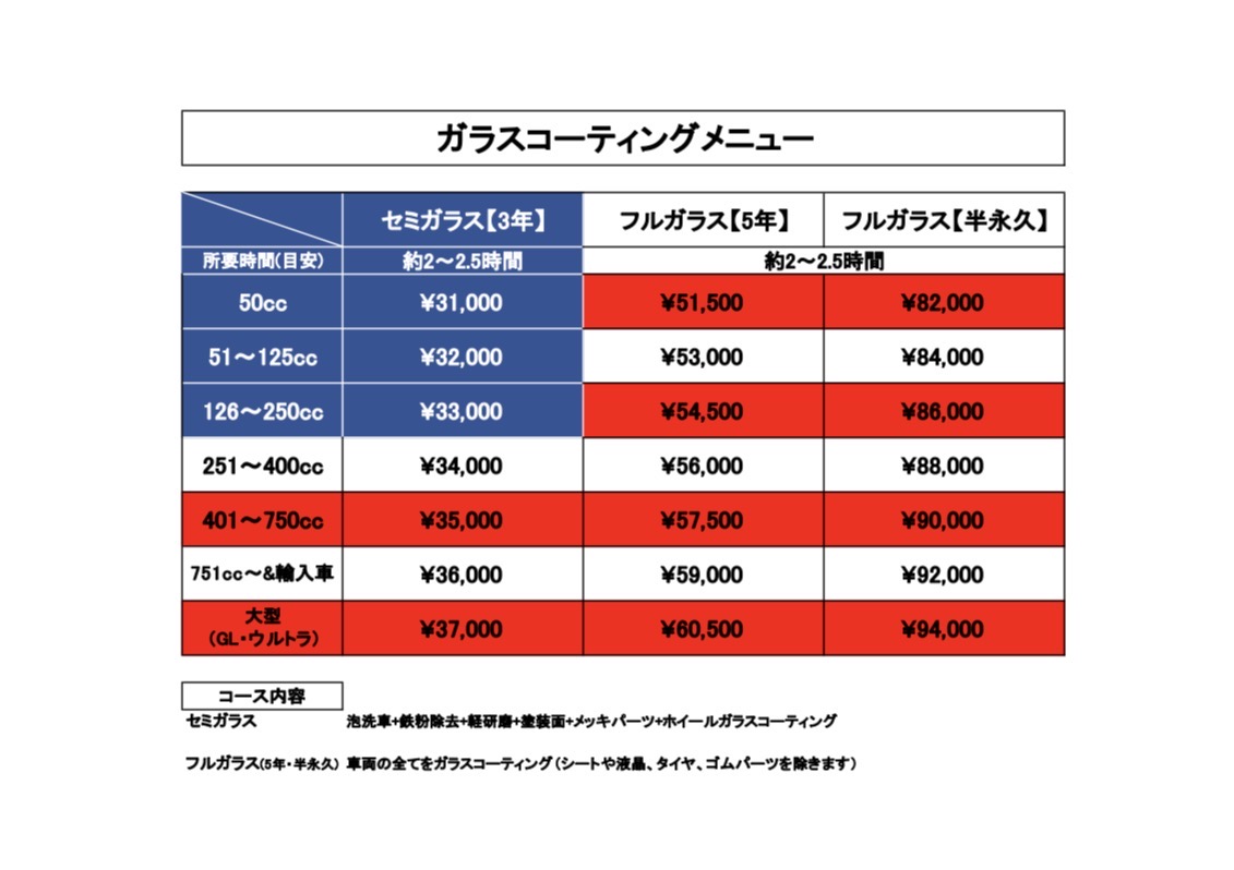 大きく分けて、持続期間と施工範囲、施工方法の3点になります。持続期間はセミガラスが約3年に対し、フルガラスが 約5年or半永久的に持続します。施工範囲はセミガラスが塗装面やメッキパーツ・ホイールなどに対し、フルガラスは細部含む車両全体になります。施工方法はセミガラスがスポンジで塗り込み、フルガラスはスプレーガンで吹き付けます。
