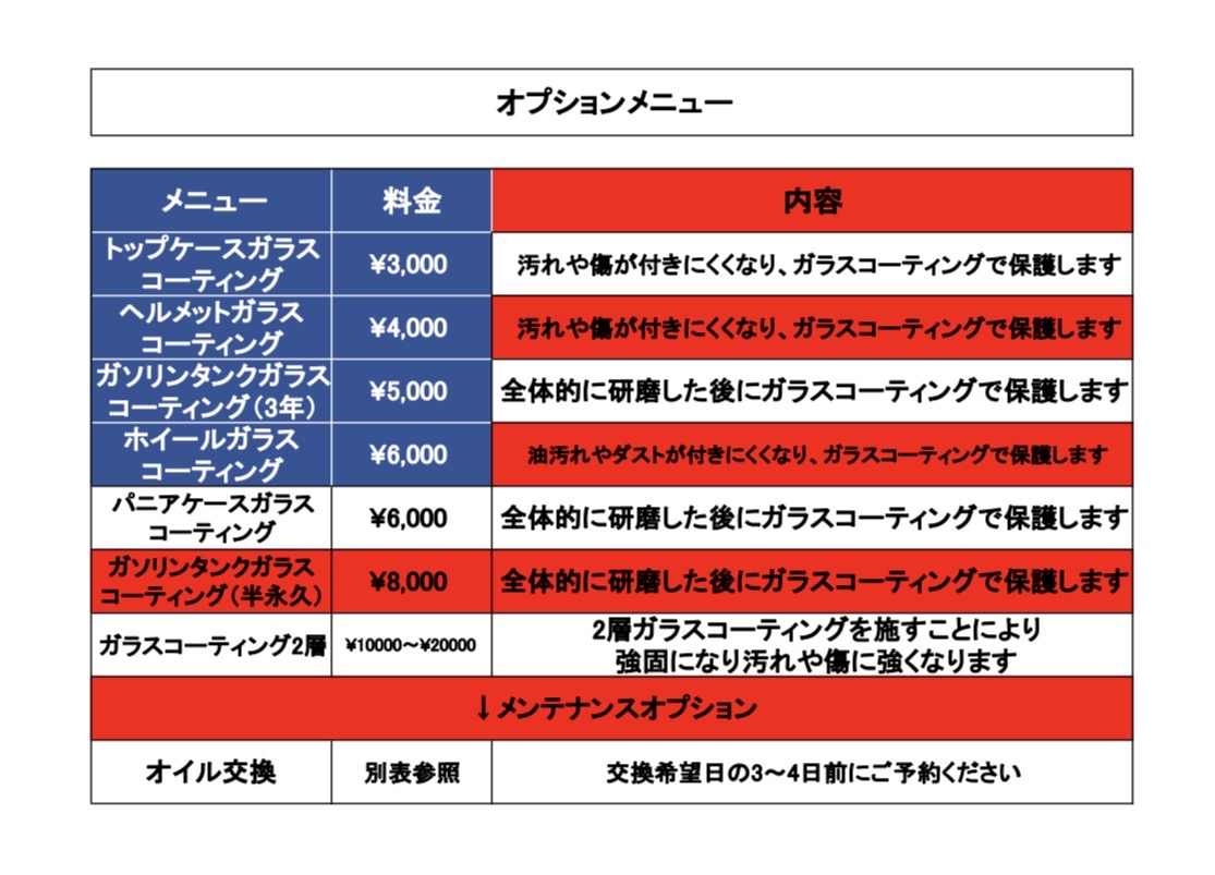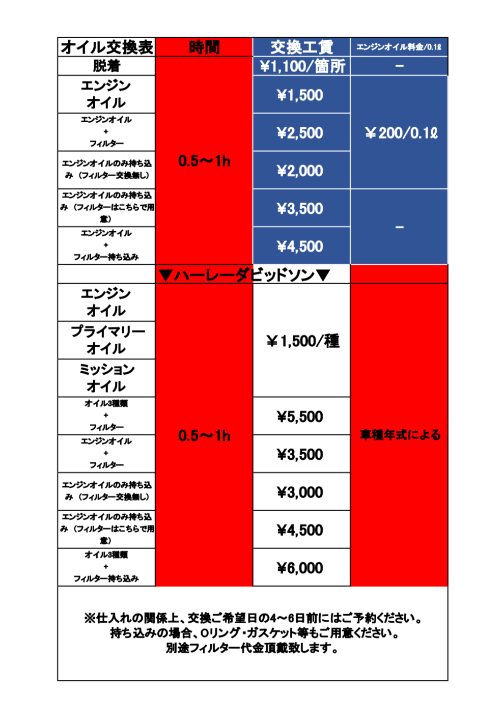 受け付けております、詳しくはお問い合わせください。(お問い合わせの際には車種と年式、フィルター交換の有無をお伝えください)工賃や料金は下記表をご参照ください。※作業希望日の3〜4日前にはご予約ください。使用オイルはモチュール10W-40になります。持ち込みや指定オイルの仕入れも可能なので詳しくはご相談ください。