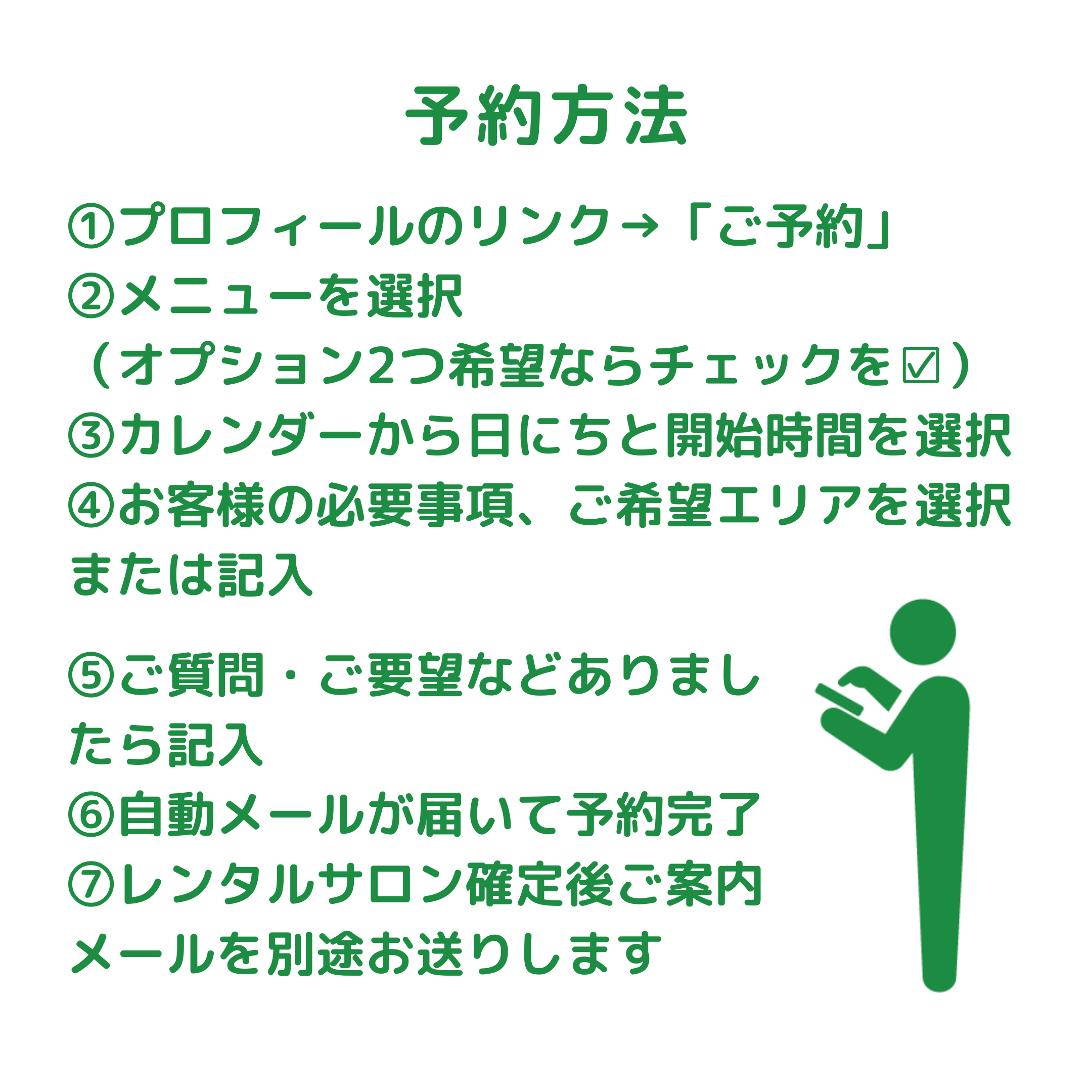 ・ご希望エリアに最も近いレンタルサロンをお調べし、サロンの予約確定後、折り返しメールにてアクセス方法等詳細をご連絡致します