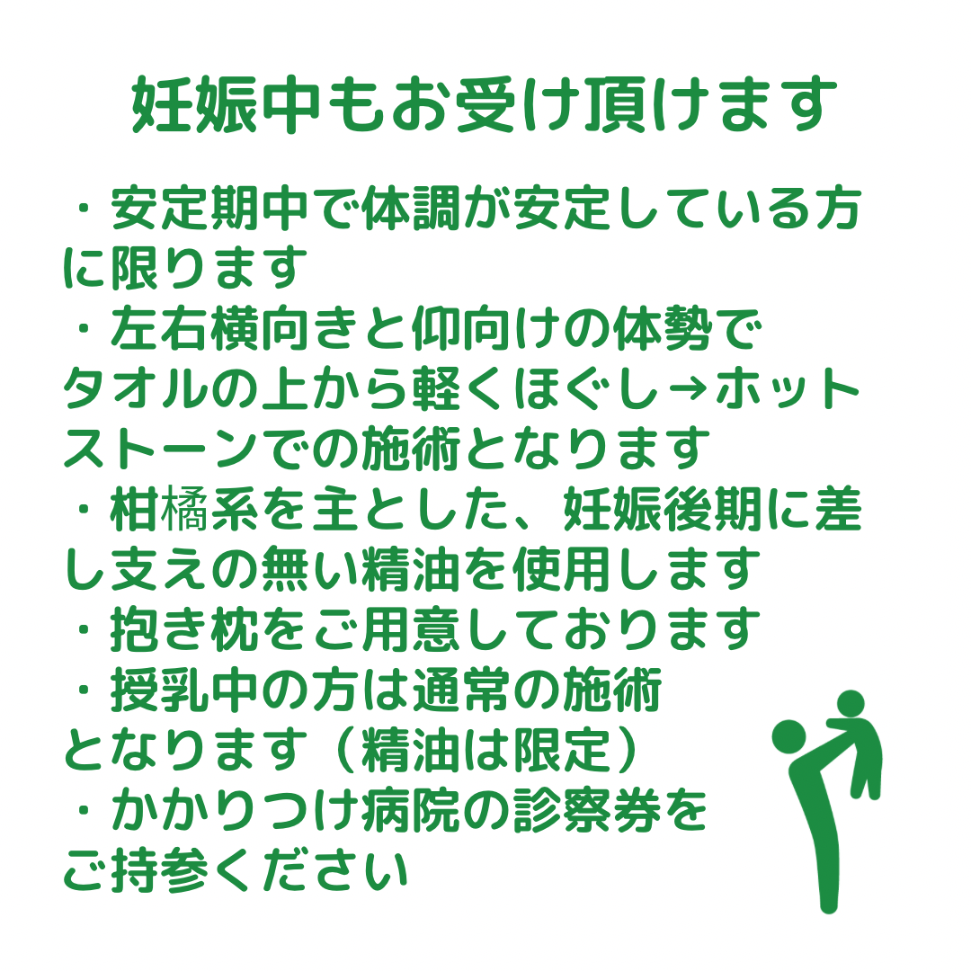 ※妊娠中(安定期)・授乳中の方は使用可能精油や手技内容が異なります 必ずご予約時に選択欄をご選択下さい