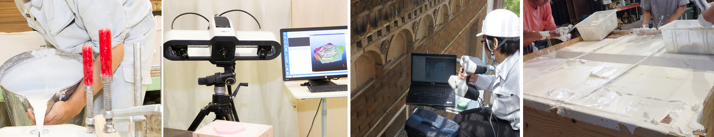 3Dスキャナーや石膏やシリコンなどを使って、対象物の形状を取り込みます。