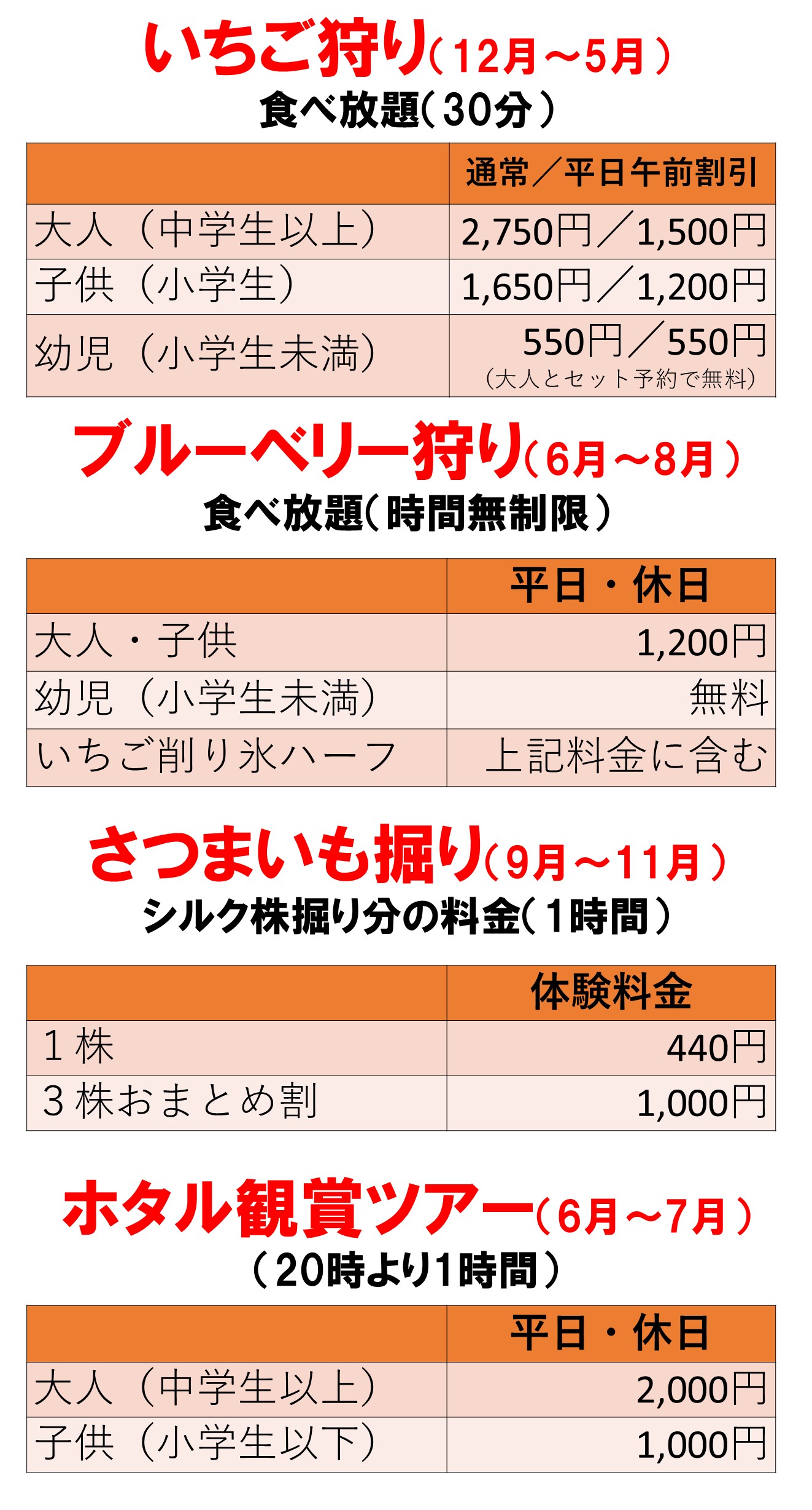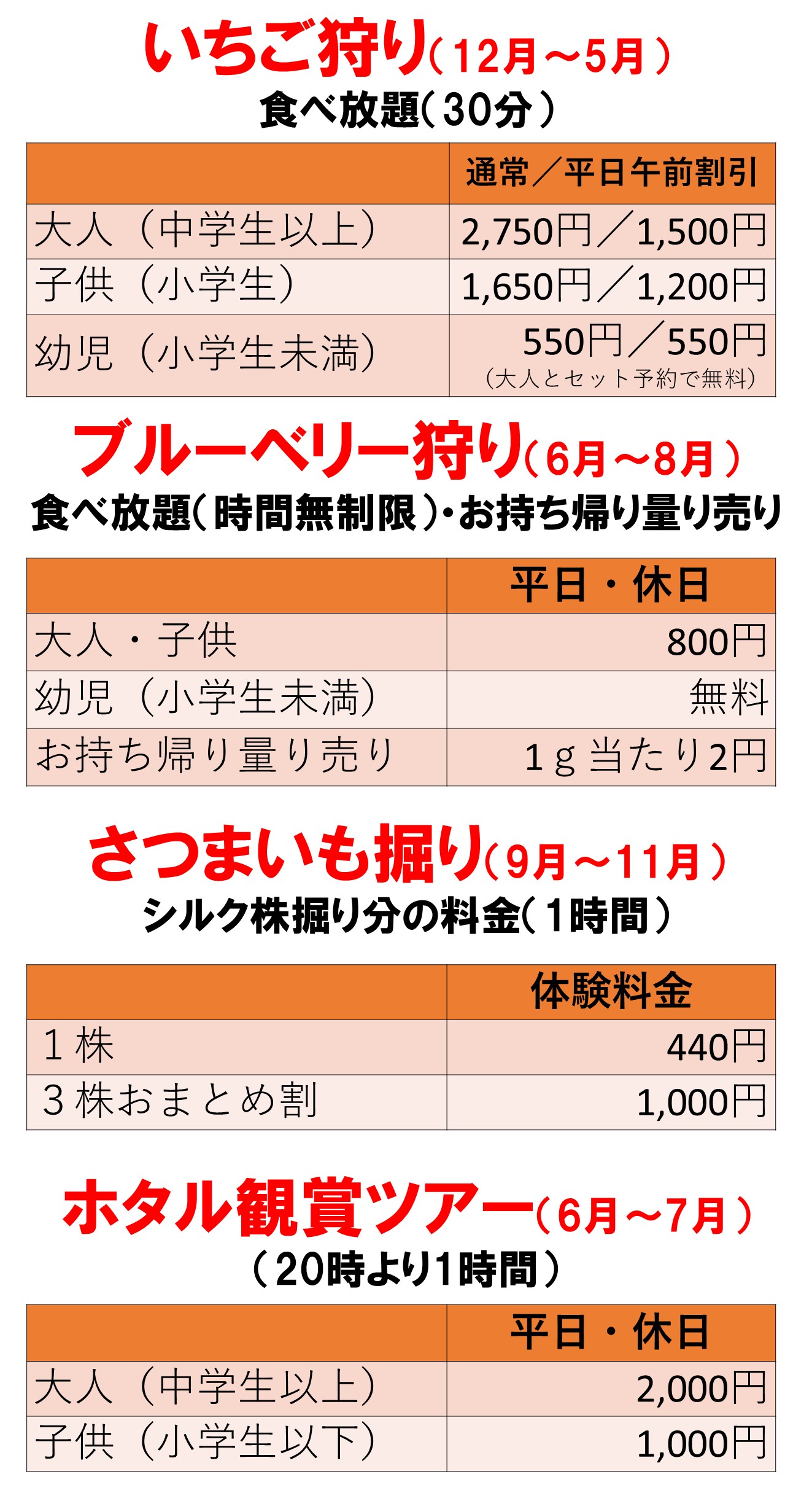| 営業時間 | 【直売所】 9:00〜17:00 【そば食堂】 9:00〜15:00(そばなくなり次第、終了) 【ファームキッチン】 10:00〜17:00(ラストオーダー16:00) 【つむつむ・ほりほり収穫体験】 10:00〜(最終受付は体験によって異なります) 【手ぶらBBQ】 第一部 10:00~13:00の間でスタート 第二部 16:00~18:00の間でスタート 各スタートより120分制(ラストオーダー90分経過時) ※最新の営業スケジュールは予約サイトで確認をお願いいたします。 |