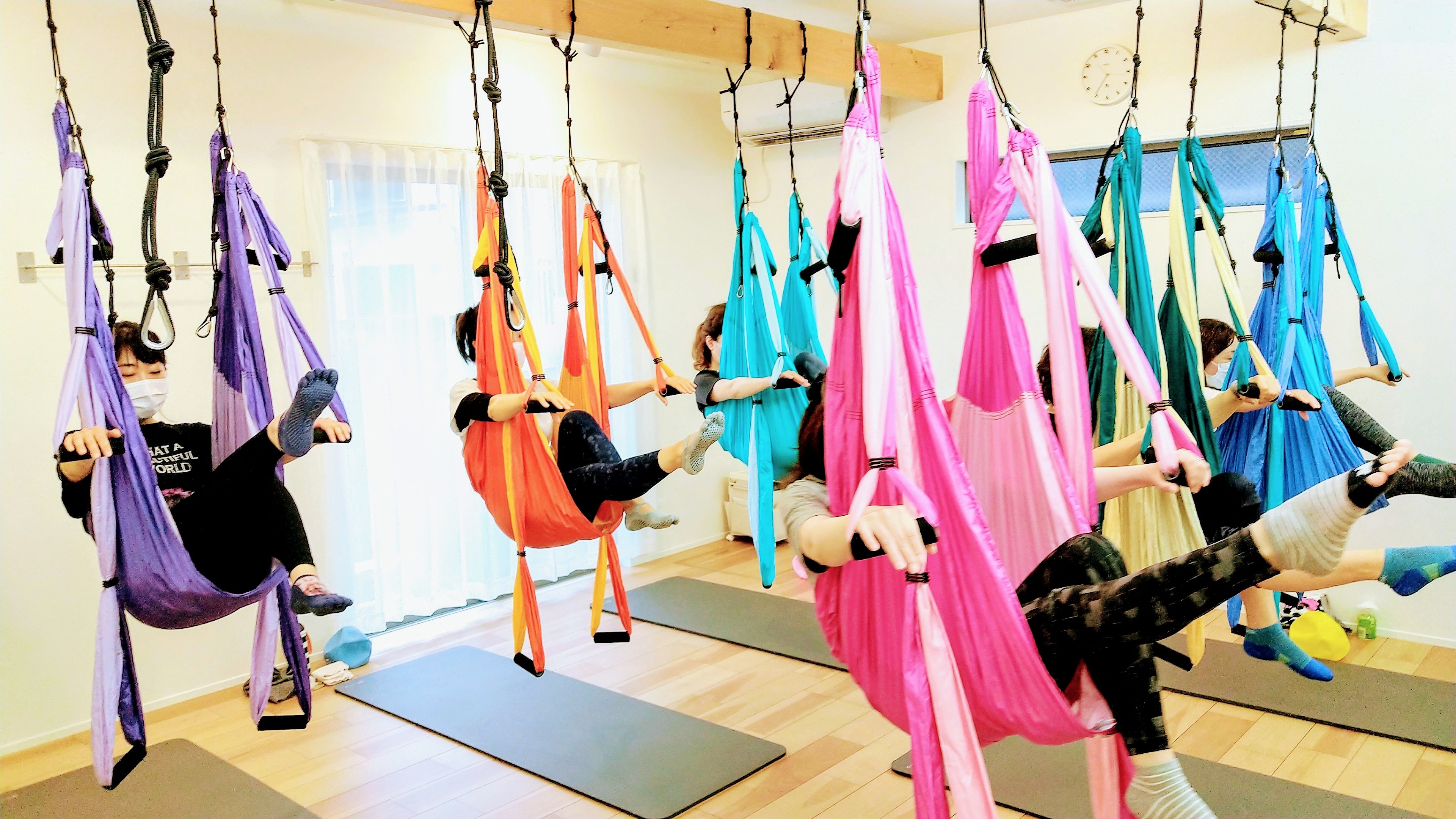 6つのハンドルとハンモックを使用し、不安定な空中でピラティスを行うことにより普段意識しづらい深層部の筋肉を使うことが可能になります。身体の軸が整い、姿勢改善や体型改善にも効果的です。筋力アップだけでなく柔軟性のアップ、ストレス解消にもおすすめです。