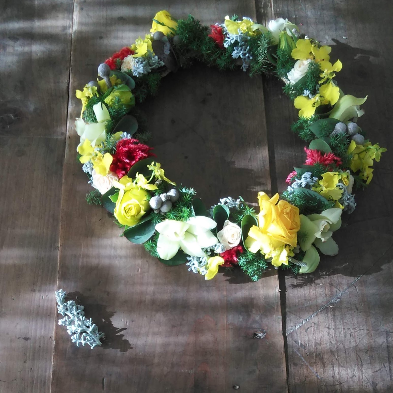 生花のレイを身につけたことがありますか?自分で編んだレイの香りと生命力を身につけられたら感動!クリスマス限定のレイのリースにもなります。未経験者大歓迎