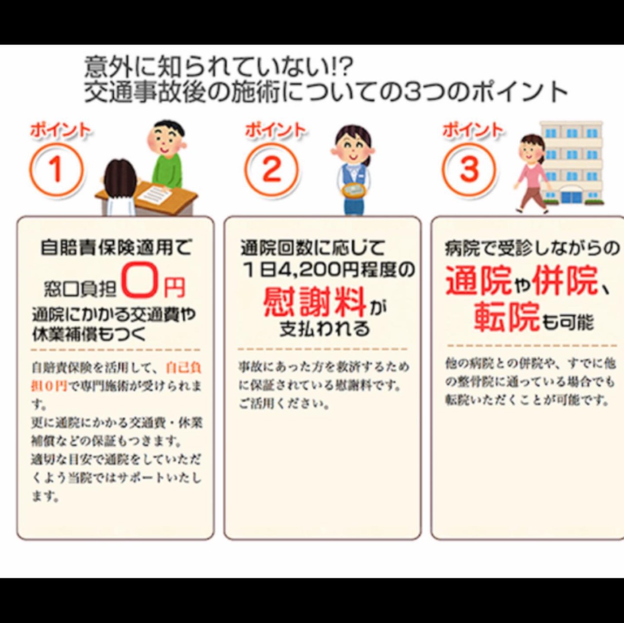 交通事故治療対応 ③治療はもちろん、保険会社とのやりとり等をアドバイス