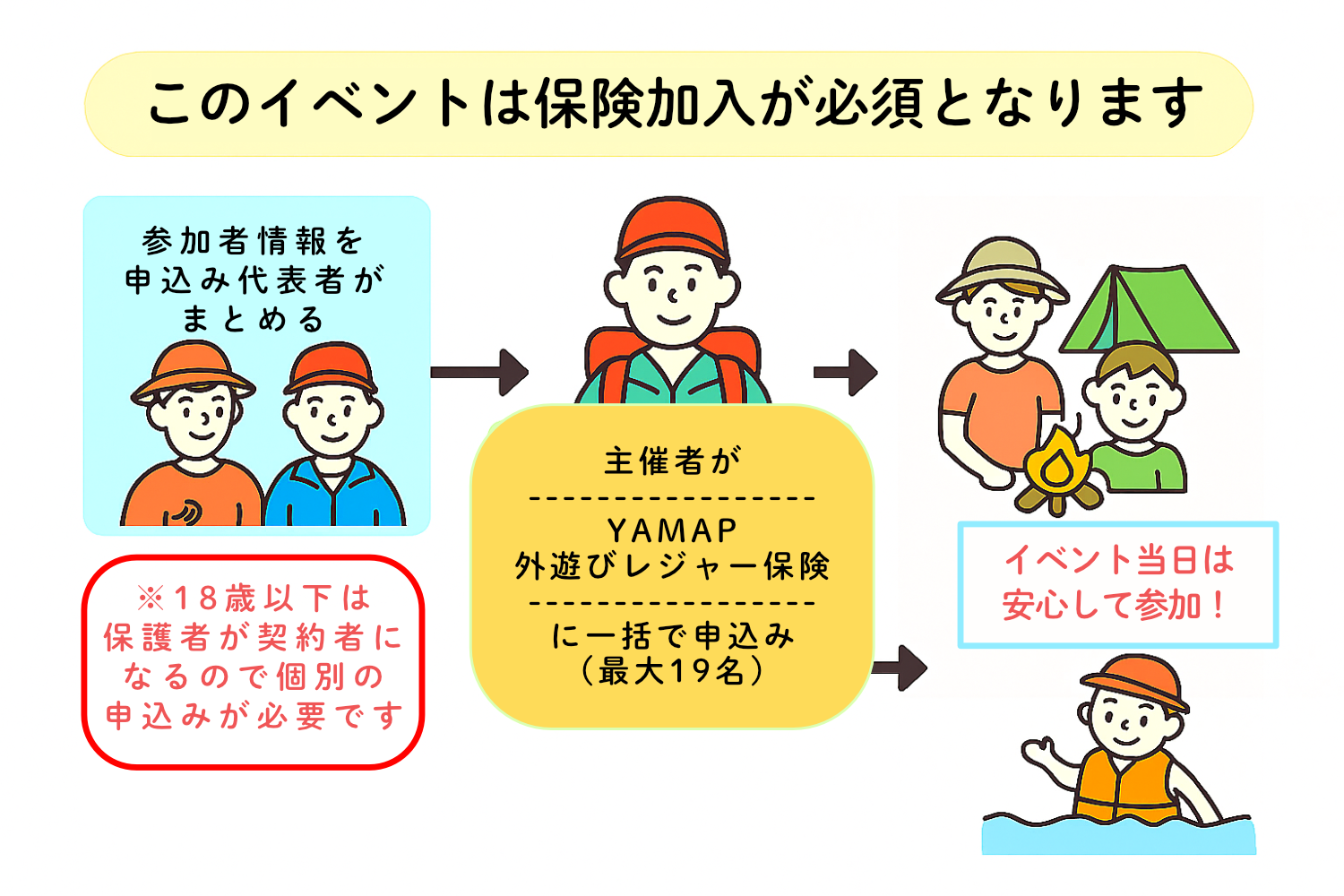 本イベントでは、YAMAP「外あそびレジャー保険」(提供:株式会社ヤマップネイチャランス損害保険)に、全参加者の加入を義務付けております。