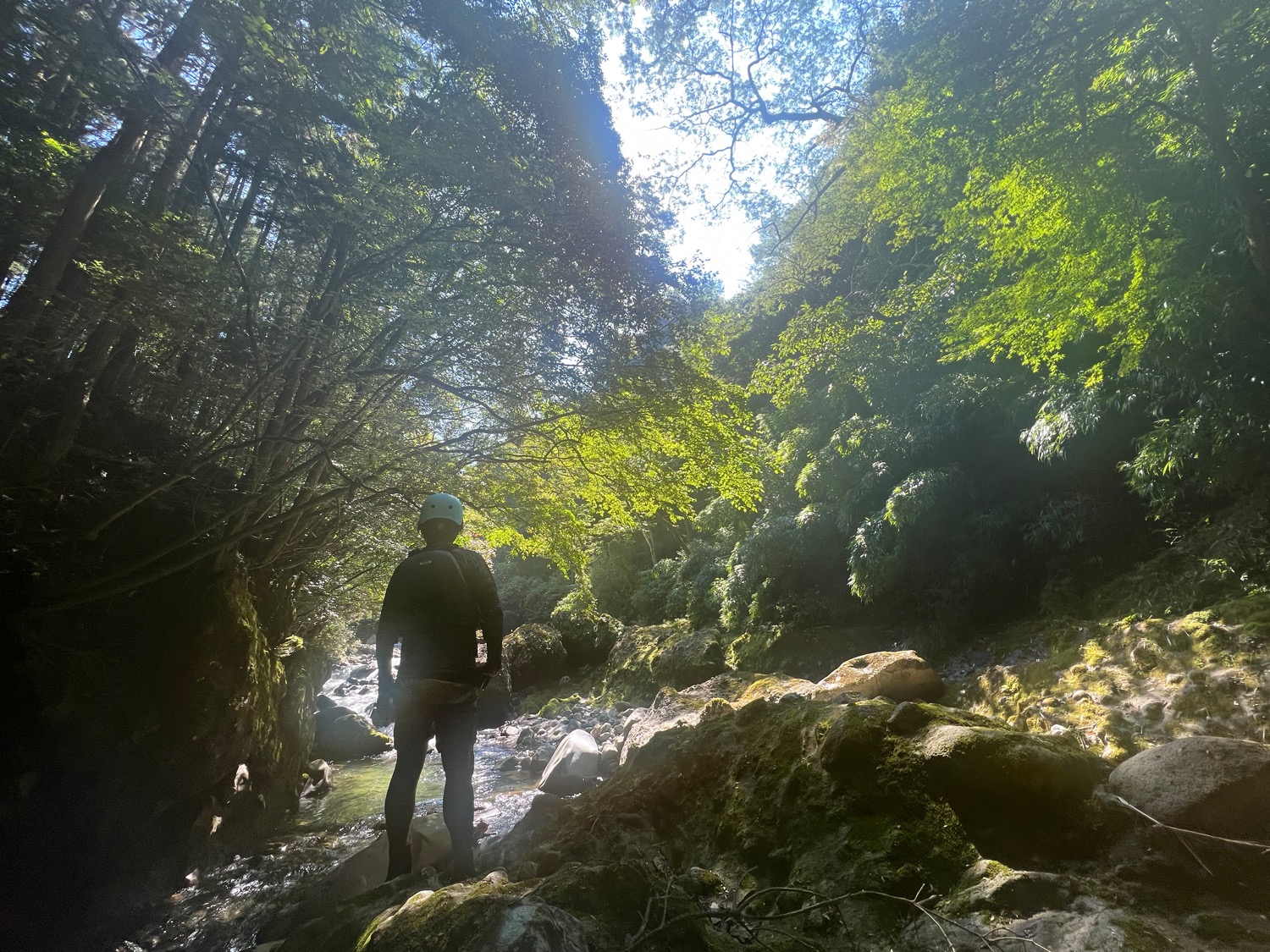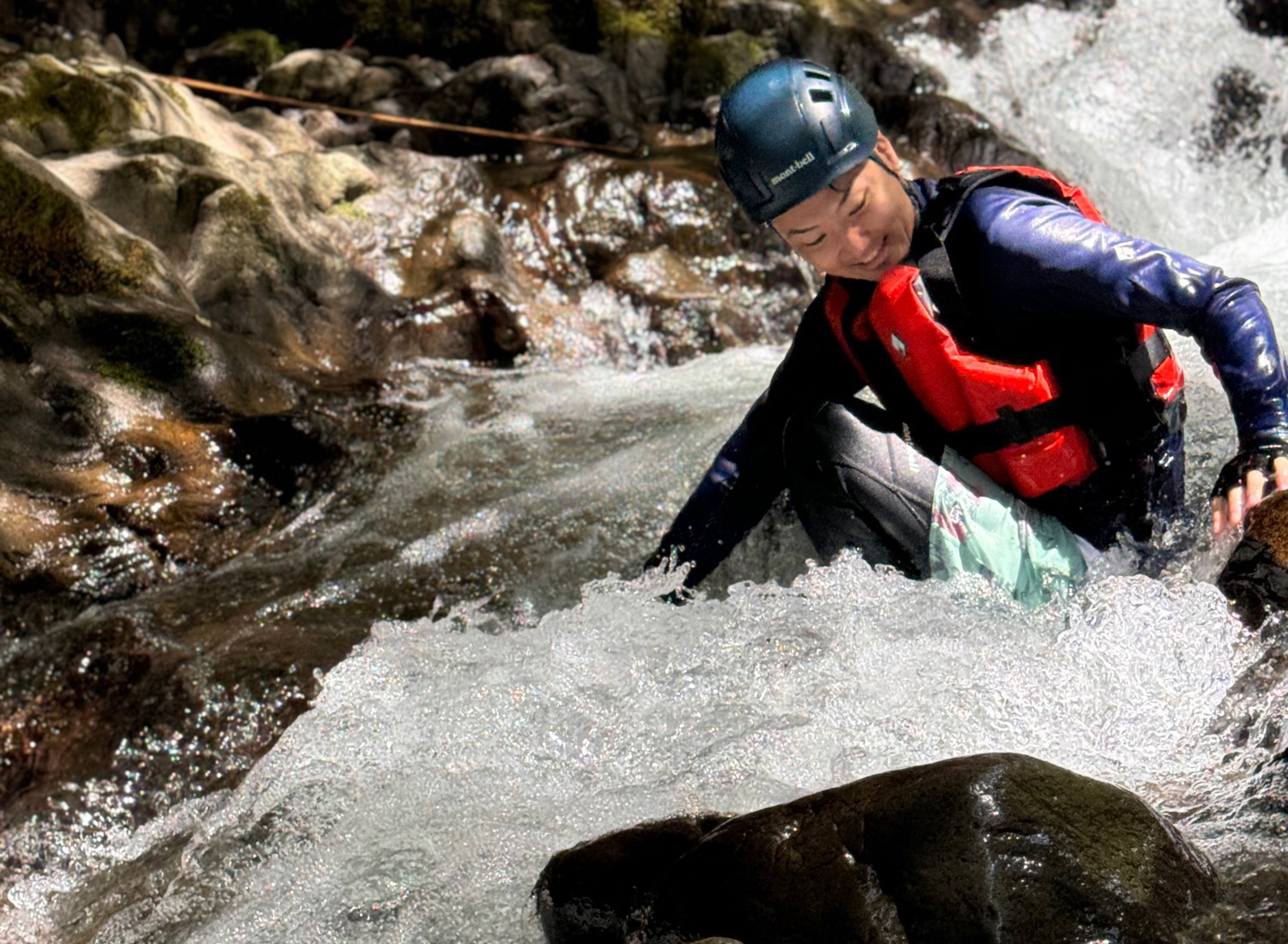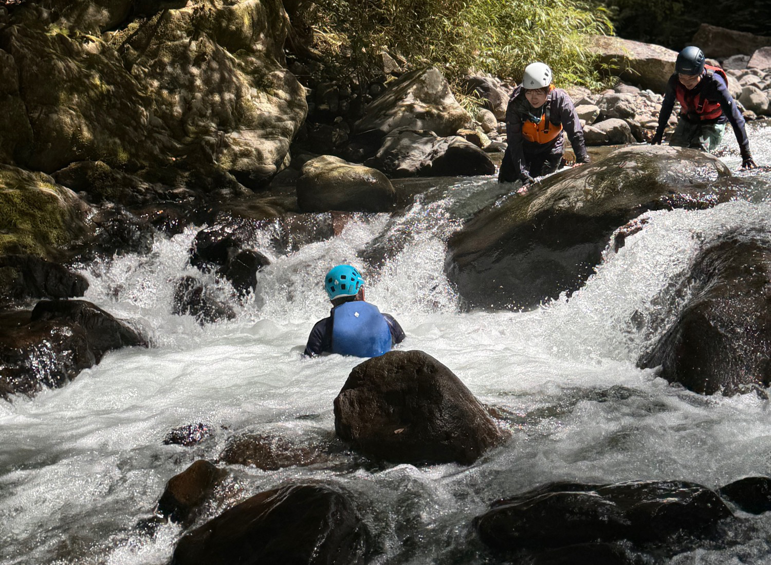 岩をよじ登ったり、流れの中を歩いたり。体を使ってしっかり遊べるコースです。