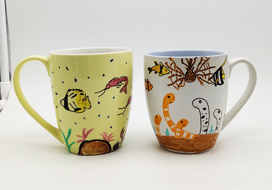 マグカップに専用のマジックで絵やメッセージなどをお絵かきして、オーブンで焼いて作ります。
